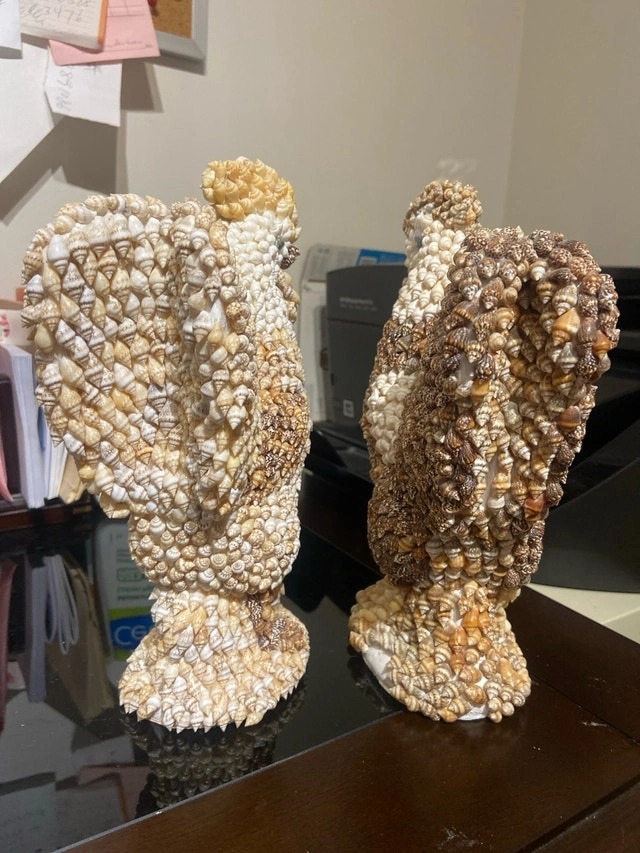Add a touch of coastal charm to your home decor with these unique, used seashell rooster figurines, each meticulously crafted with small seashells to create a textured, eye-catching piece. These decorative rooster figures are perfect for collectors or anyone looking to add a whimsical touch to their space. These charming roosters are more than just decor; they're a conversation starter, bringing a bit of seaside whimsy to any room! About 9.5 inches x 6 inches wide each. Due to their unique handmade nature and used condition, there may be slight imperfections that add to their character and charm. I am pricing these at $55 considering their excellent condition.