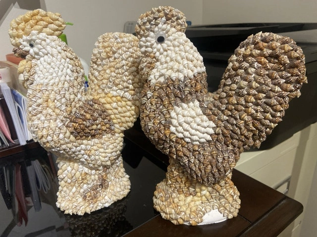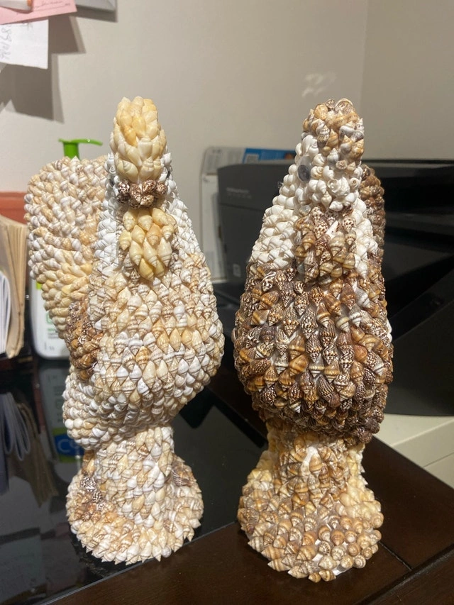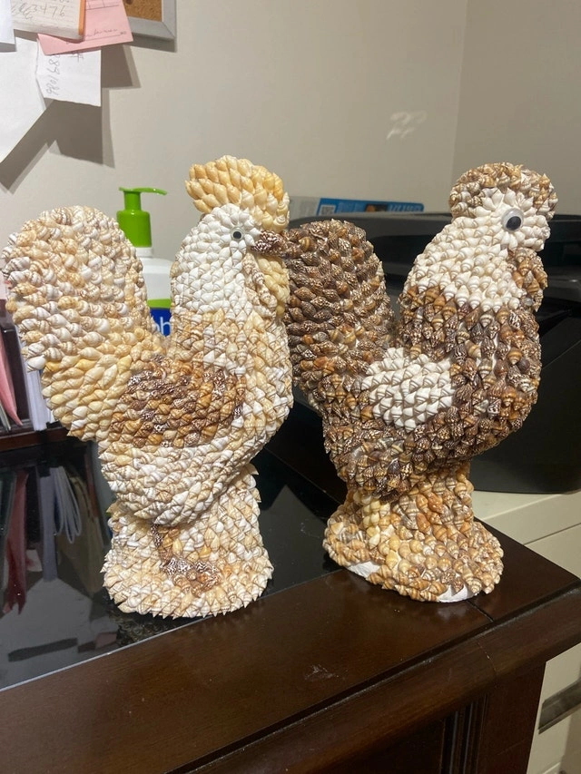 Add a touch of coastal charm to your home decor with these unique, used seashell rooster figurines, each meticulously crafted with small seashells to create a textured, eye-catching piece. These decorative rooster figures are perfect for collectors or anyone looking to add a whimsical touch to their space. These charming roosters are more than just decor; they're a conversation starter, bringing a bit of seaside whimsy to any room! About 9.5 inches x 6 inches wide each. Due to their unique handmade nature and used condition, there may be slight imperfections that add to their character and charm. I am pricing these at $55 considering their excellent condition.