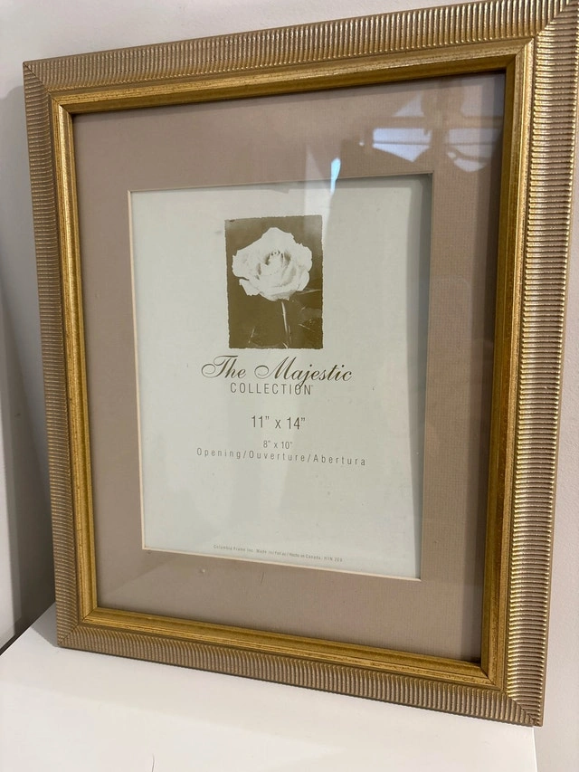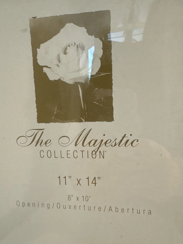 This Majestic Collection picture frame is designed to display your cherished memories with elegance. It holds an 11" x 14" photo, with an 8" x 10" opening, and has a stylish gold finish that adds a touch of sophistication to any room. This frame is in great condition, ready to showcase your favourite photo or art piece. Here are the specifications: