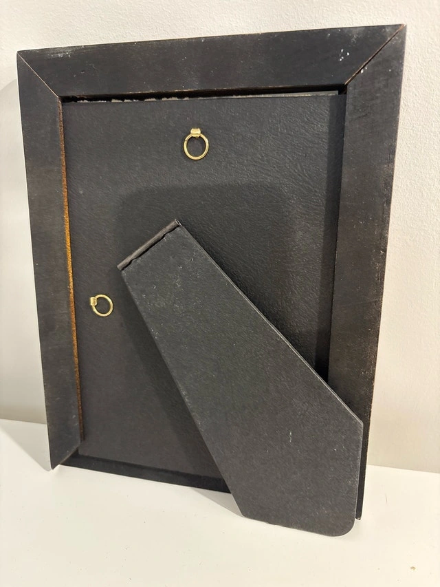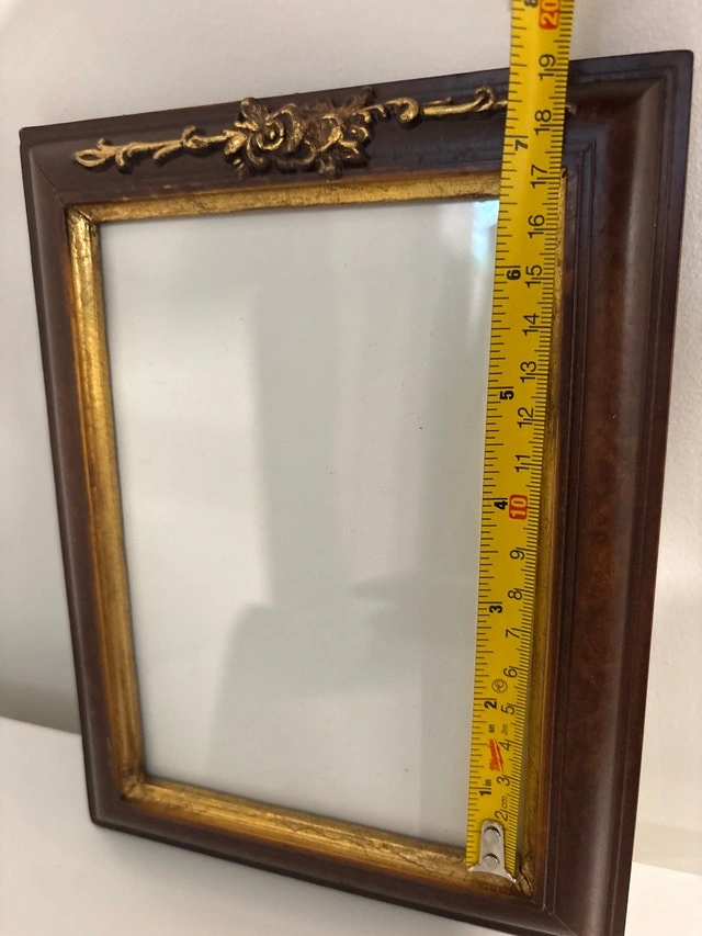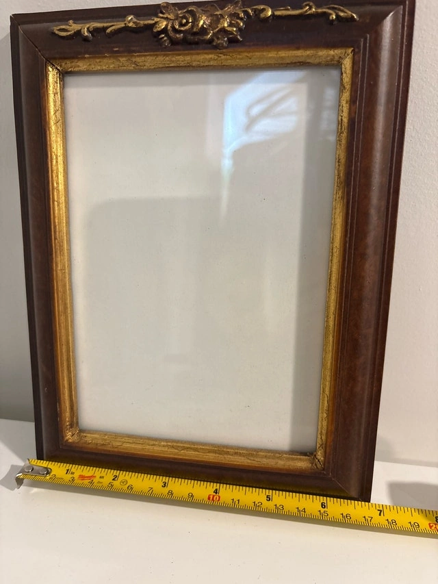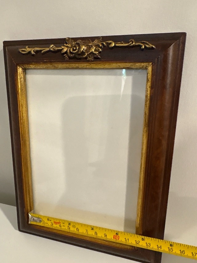 This elegant, used picture frame features a rich, dark wood finish accented with ornate gold detailing, perfect for showcasing cherished memories with a touch of classic style. It measures approximately 19 inches in height and 16 inches in width. Add a touch of class to your photos!
