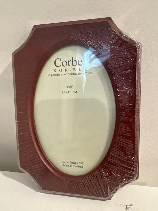 Add a touch of elegance to your cherished memories with this new Corbel 4x6 inch picture frame, featuring a genuine wood finish. Still sealed in its original packaging, this frame is ready to showcase your favourite photo.