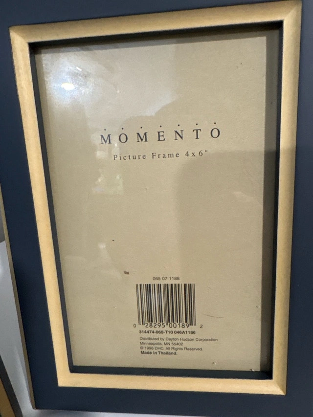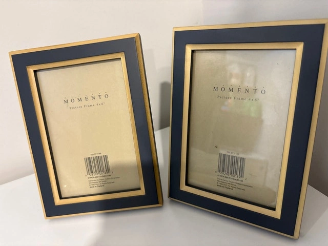 These are two Momento Picture Frames designed for 4x6 inch photos, perfect for displaying your cherished memories. These frames have a navy colour on the outside and gold on the inside closest to where the photo sits. They have never been used. Brand: Momento