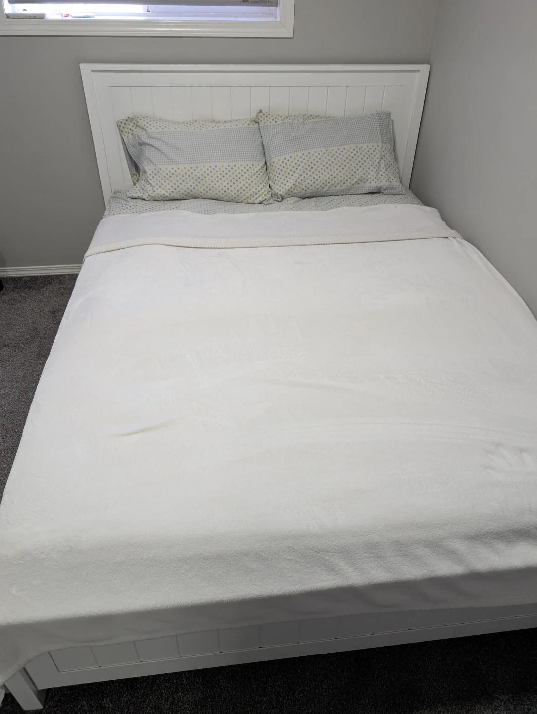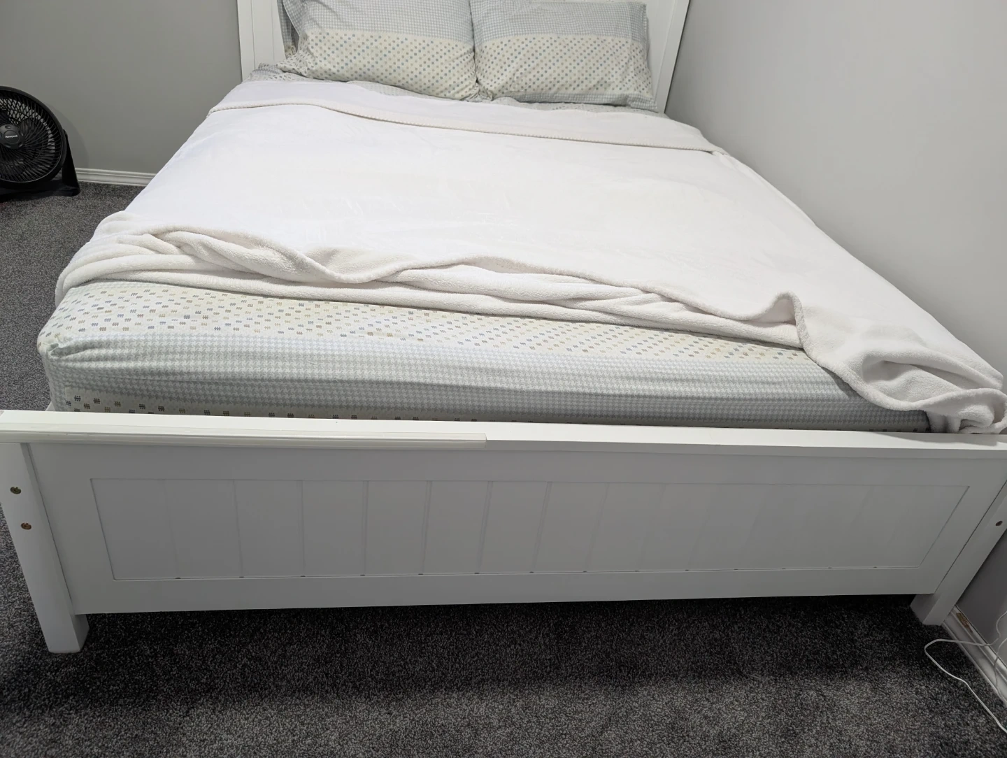 White solid wood queen bed frame by Red Barrel studio and queen size mattress. Very elegant and beautiful. Bought new from Wayfair for 450 cad.