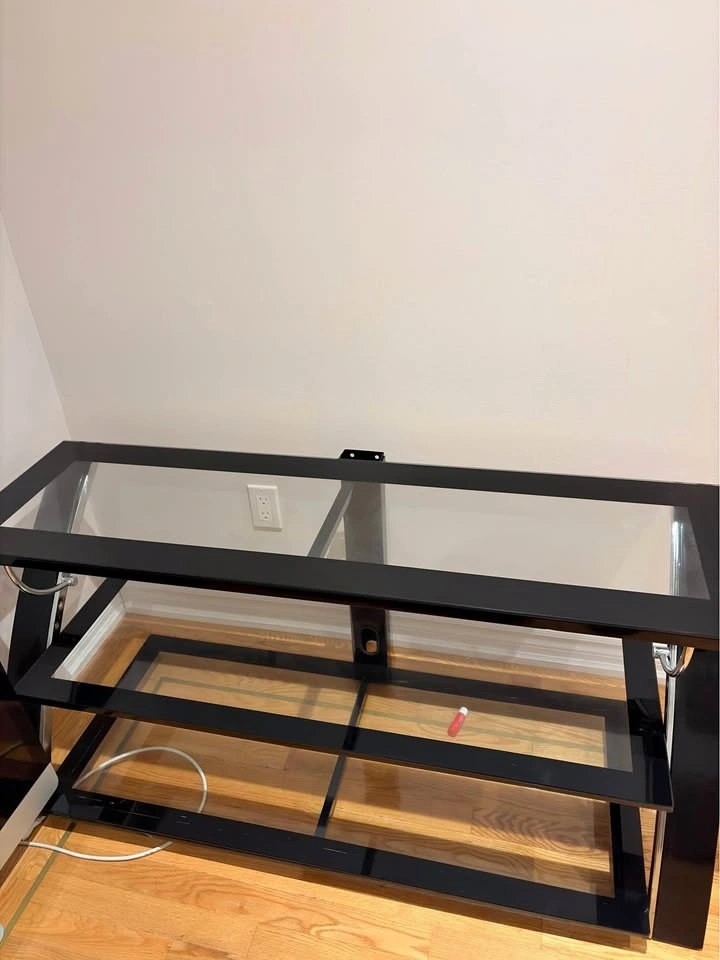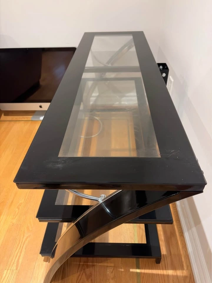 Stylish modern TV stand with a black glass and metal design. Features a spacious top surface and multiple glass shelves—perfect for a TV, sound system, gaming consoles, or media accessories. Solid and stable construction with a sleek, contemporary look that fits well in any living room or entertainment space.