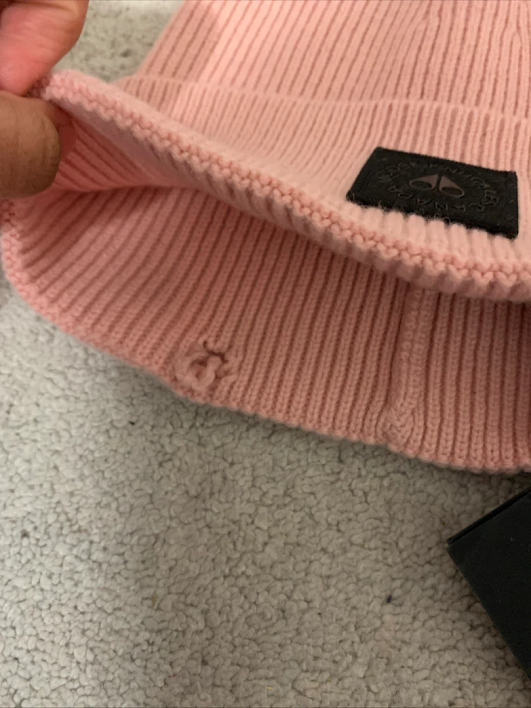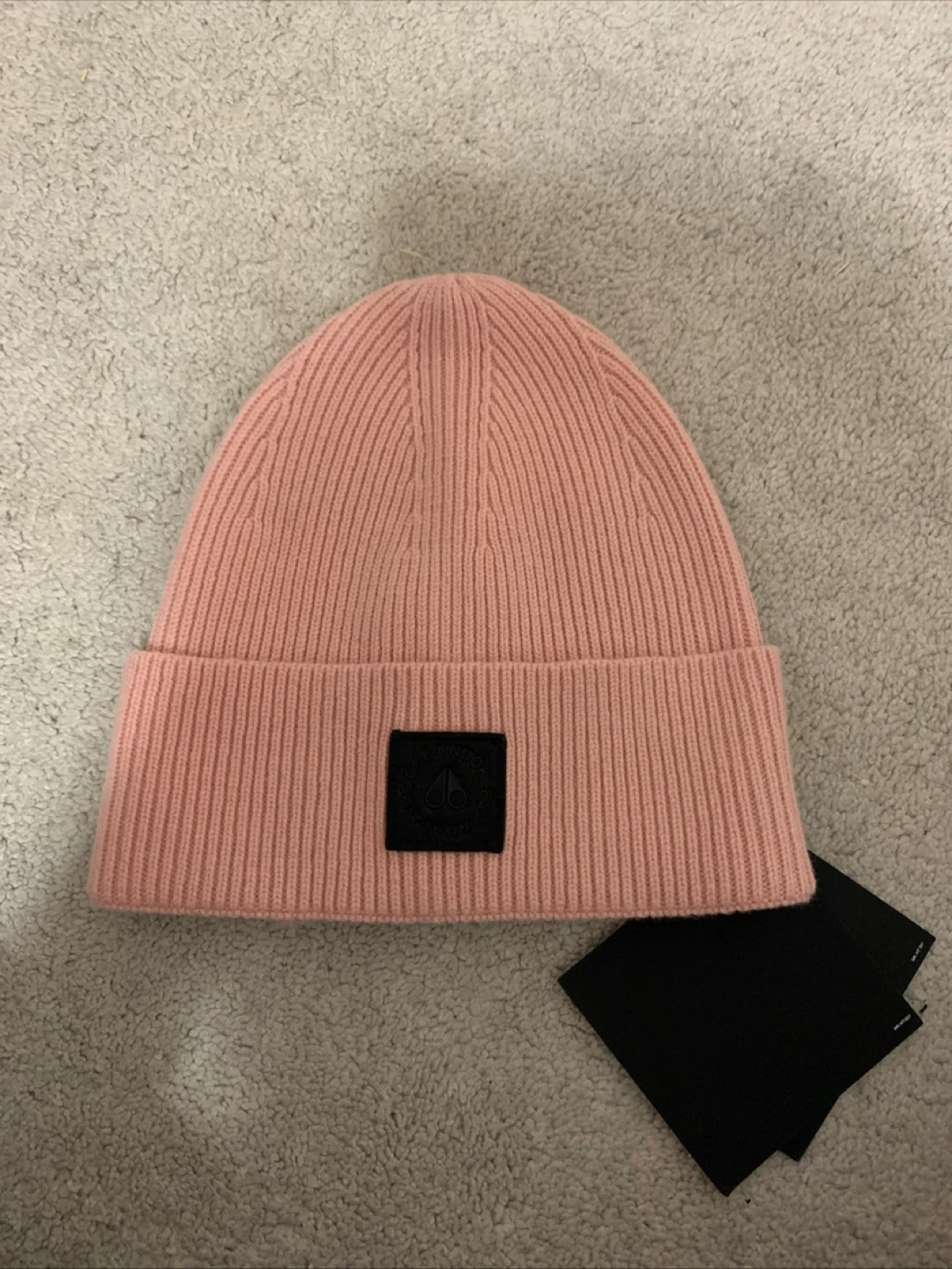 Selling a gently used Moose Knuckles beanie in a lovely rose colour! It's super cozy and stylish for those chilly days. There is a small hole near the brim, as shown in the photos.