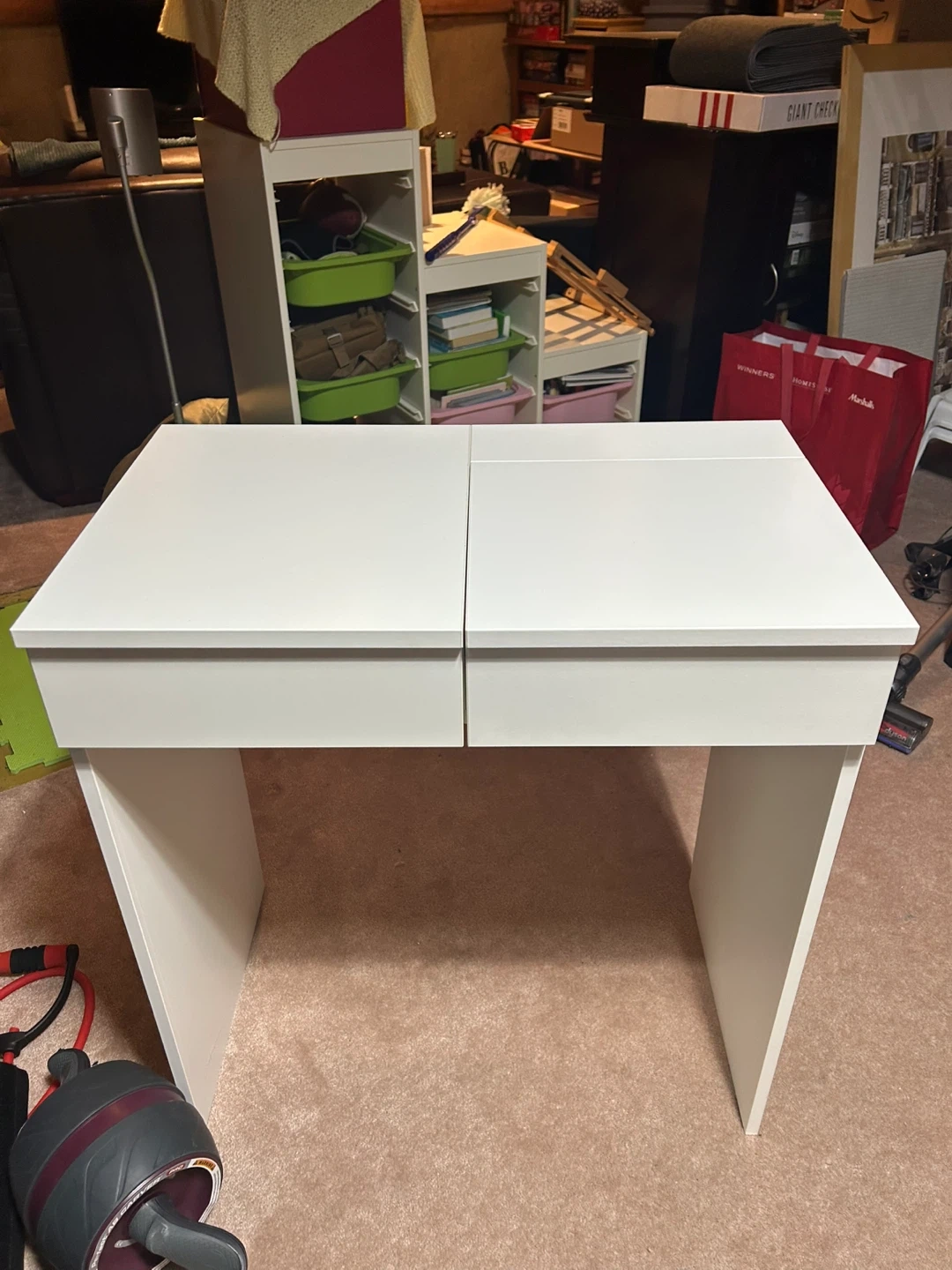This is an Ikea Malm Dressing Table. It features a clean, white finish and a functional design. The table is used and has a red felt inside the drawers and compartments for a touch of personalized flair. Perfect for makeup and accessories, this compact vanity will fit seamlessly into any bedroom or dressing area.