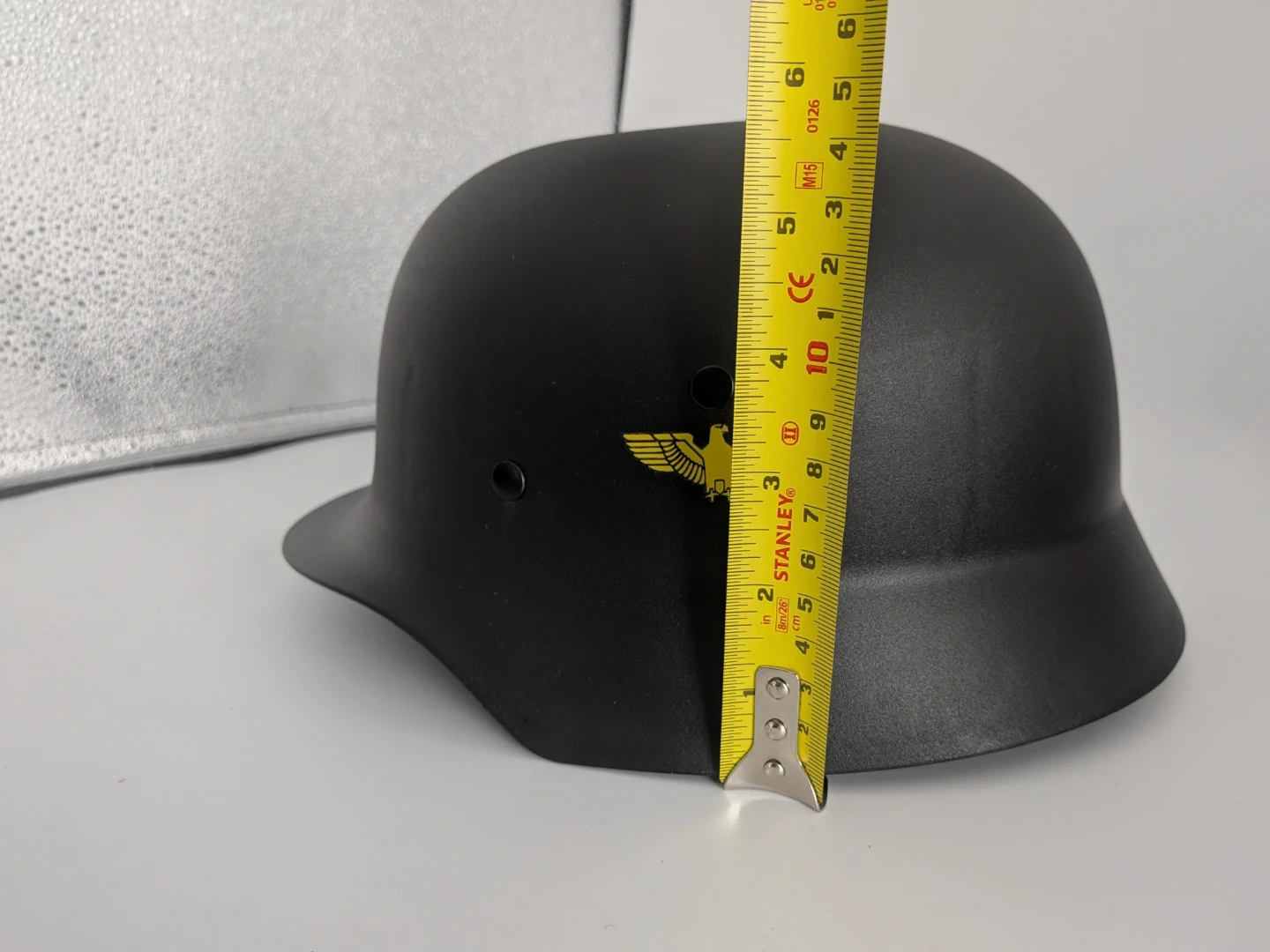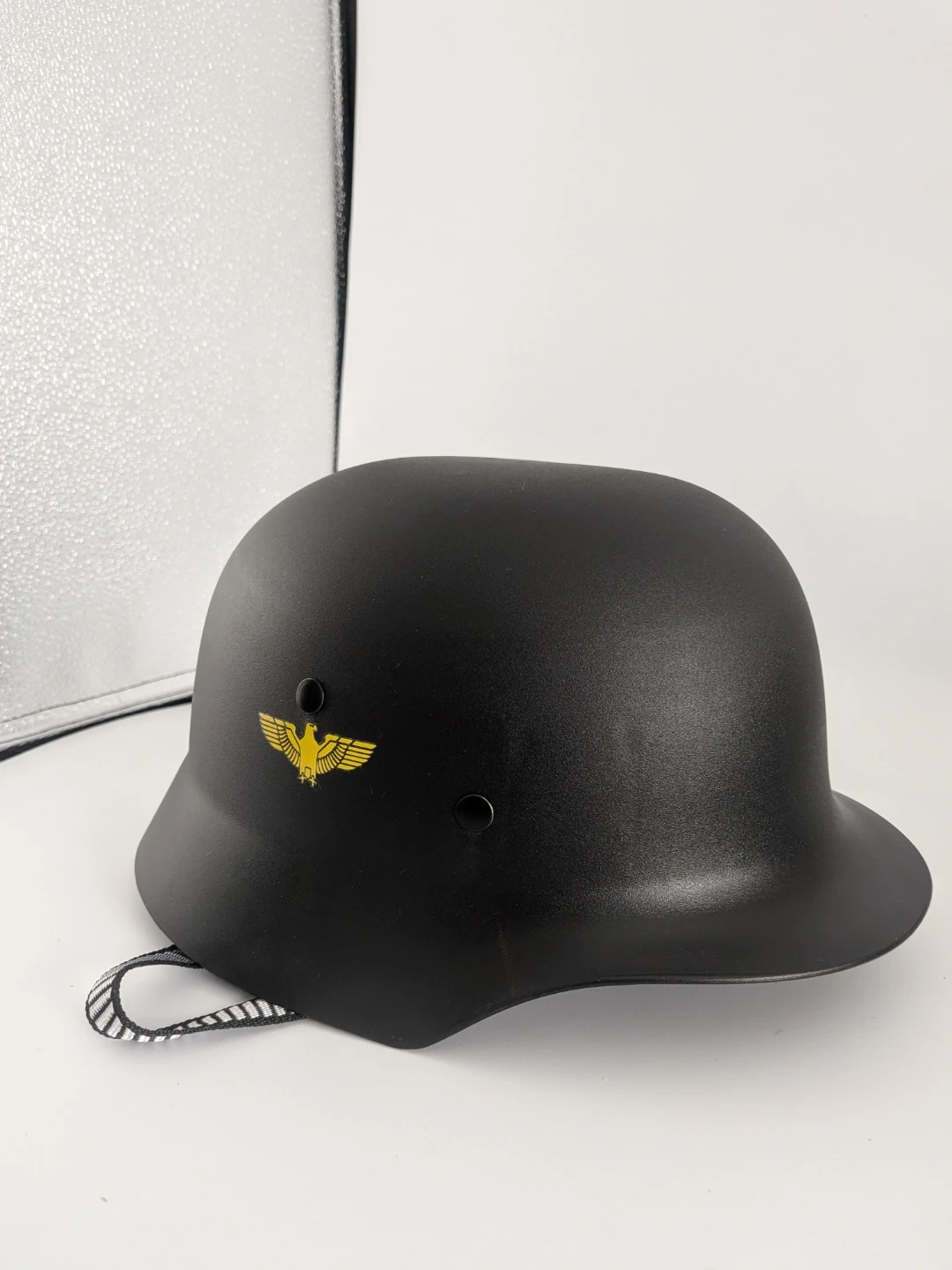 Selling a black German-style novelty helmet. It has a unique design with an eagle emblem. The helmet is new without box and has adjustable straps for a comfortable fit.