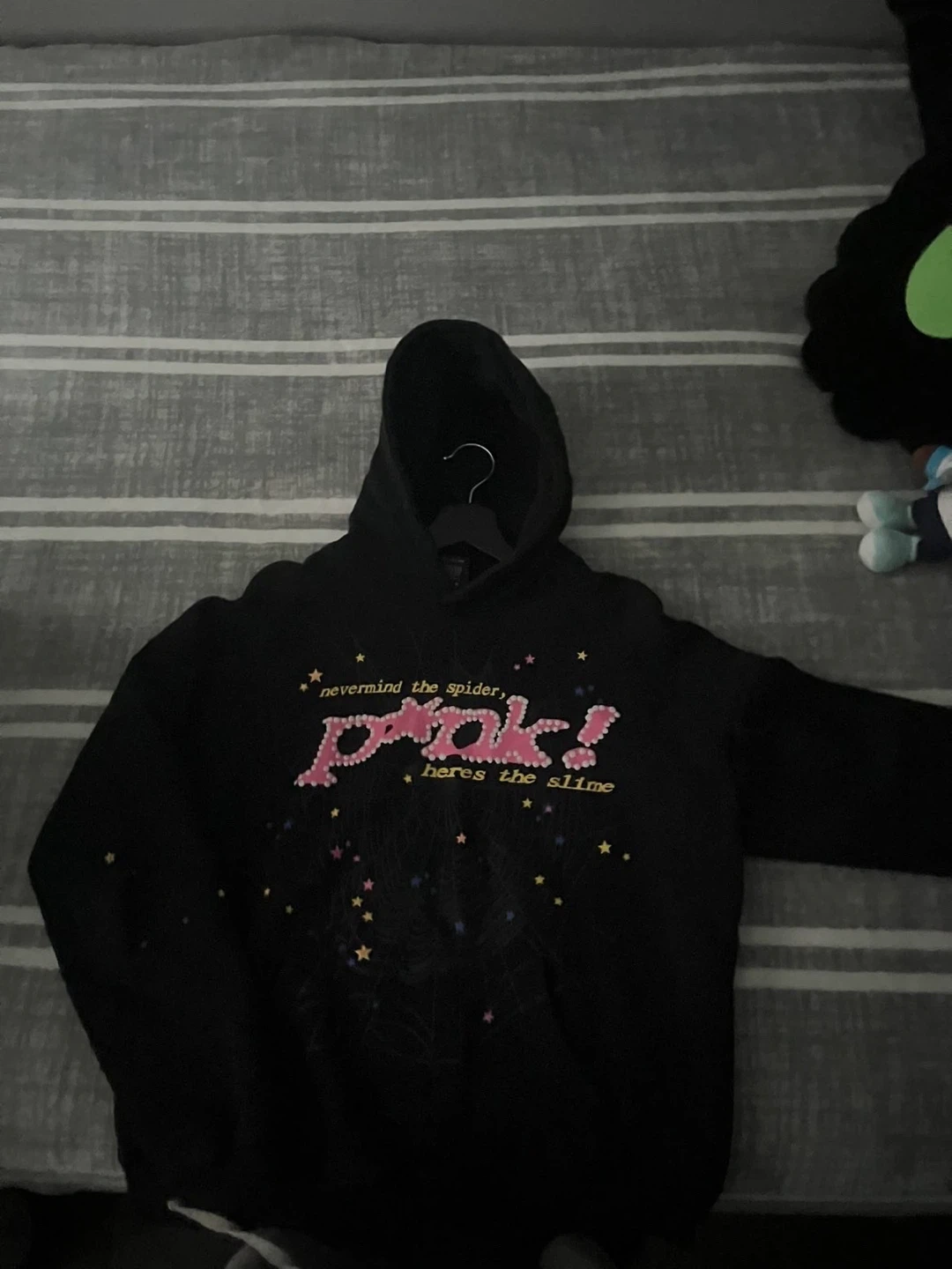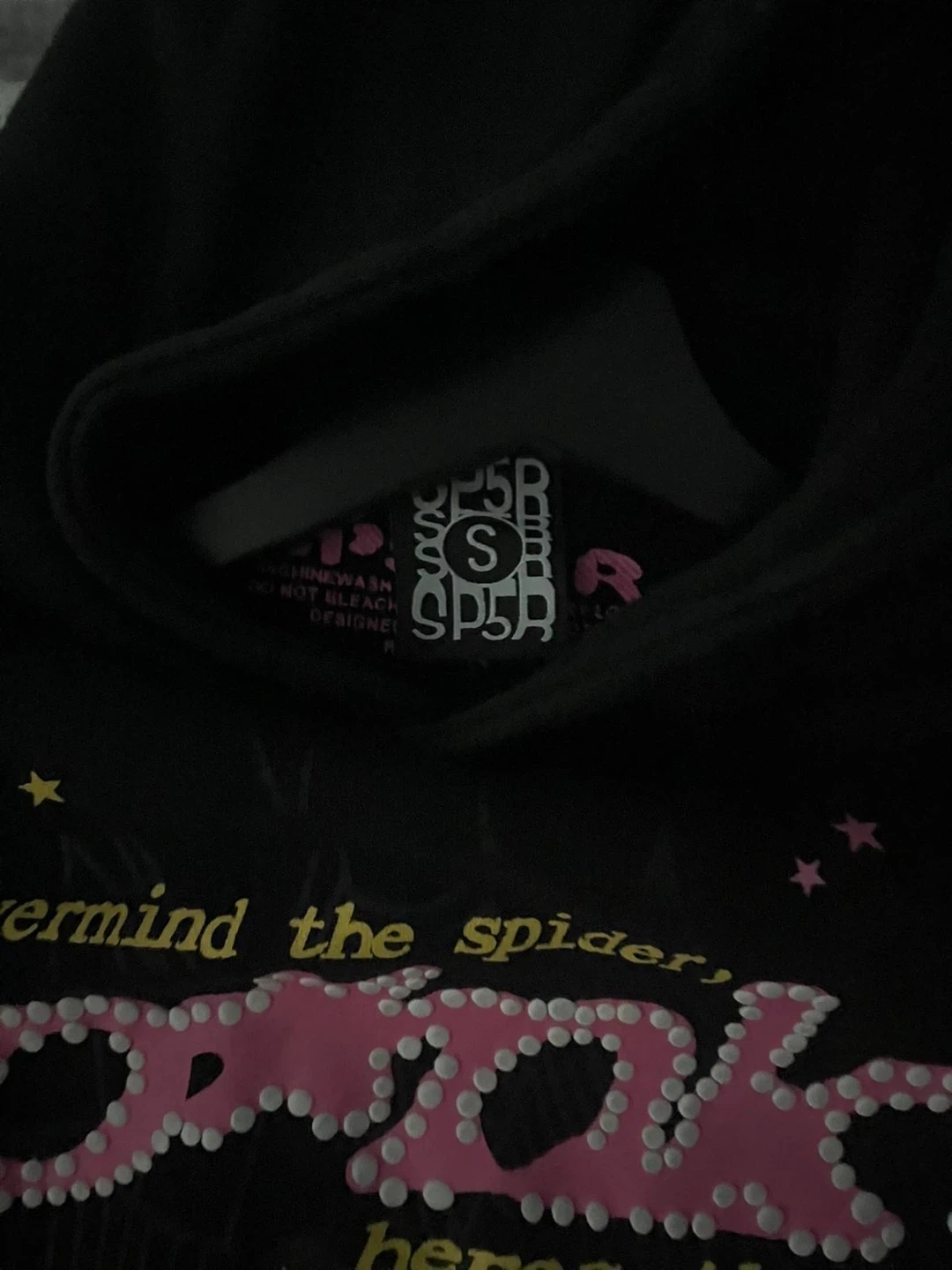Selling a SP5DER black hoodie in size small! The hoodie features the text "nevermind the spider, here's the slime". It's in great condition and ready for a new owner It’s 1:1