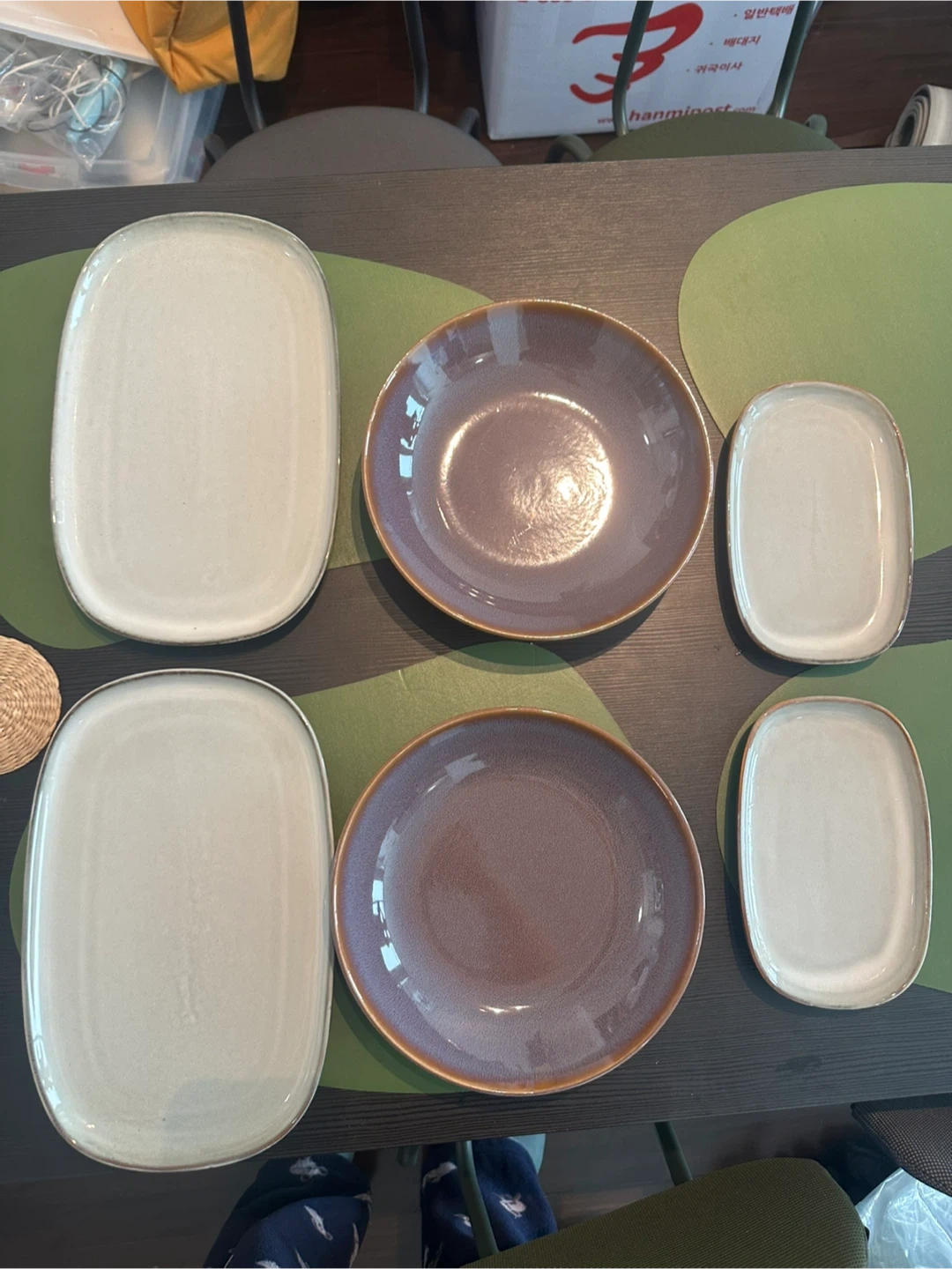 Selling a set of 6 assorted plates. There are two larger rectangular plates, two smaller rectangular plates, and two bowl-shaped plates. Perfect for everyday use or special occasions!