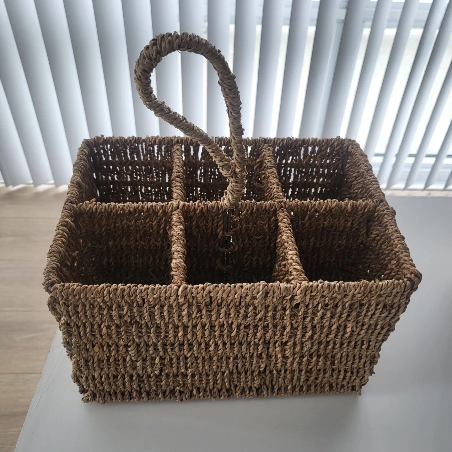 This woven seagrass storage caddy is perfect for organizing your home! It has a natural look and is made of durable seagrass material. Great for organizing your kitchen, bathroom, or office supplies