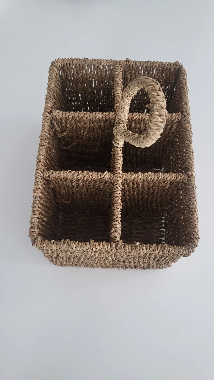 This woven seagrass storage caddy is perfect for organizing your home! It has a natural look and is made of durable seagrass material. Great for organizing your kitchen, bathroom, or office supplies