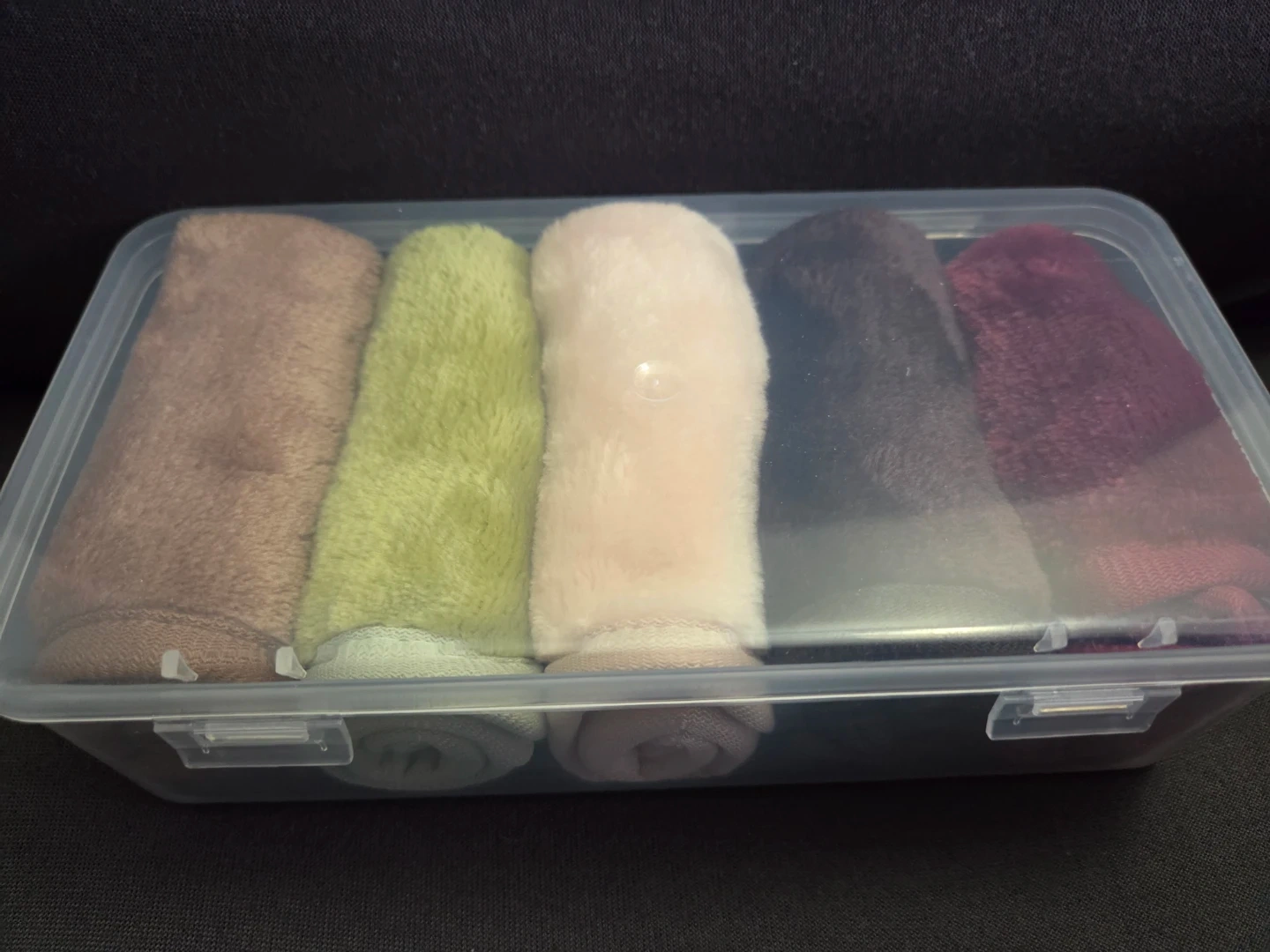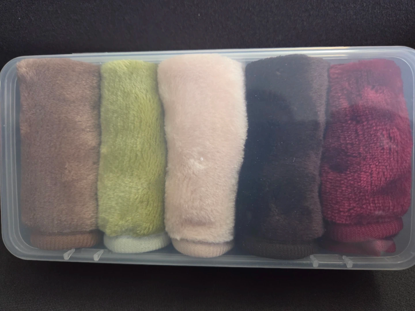 Selling a set of new, assorted microfiber face towels. They come in a clear plastic container, perfect for keeping them organized. They are brand new and never been used.