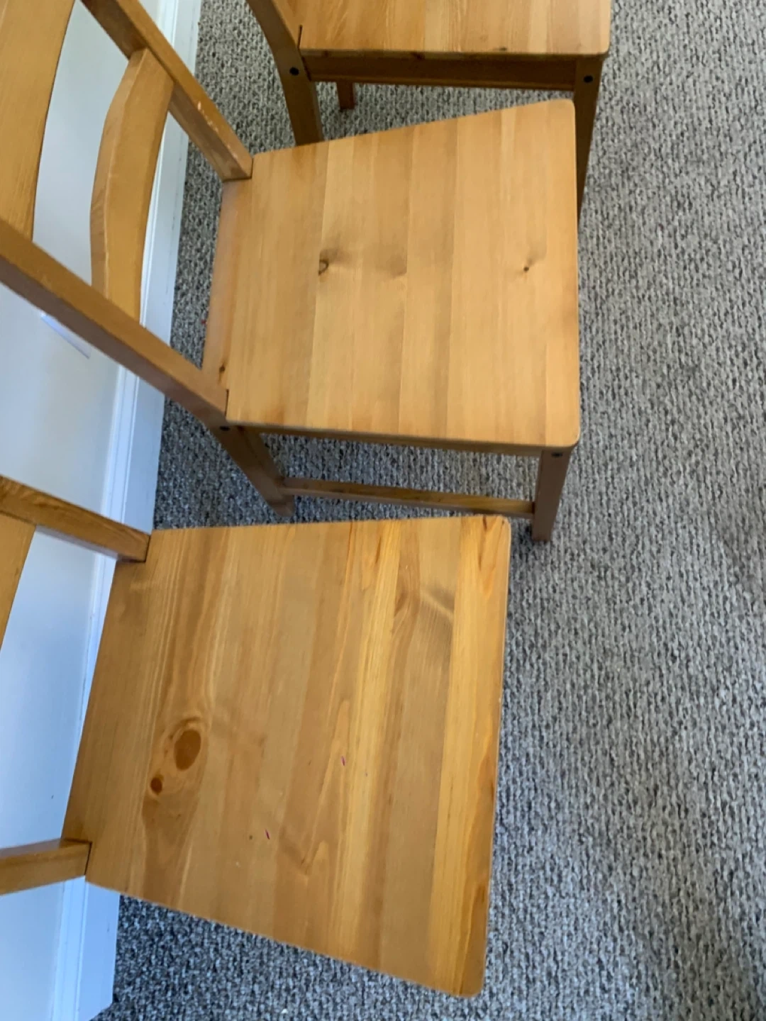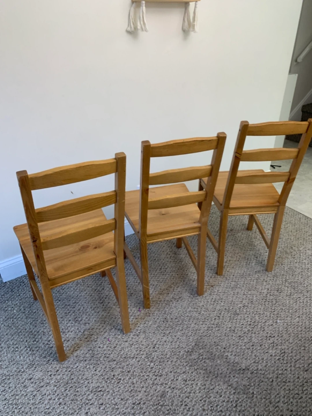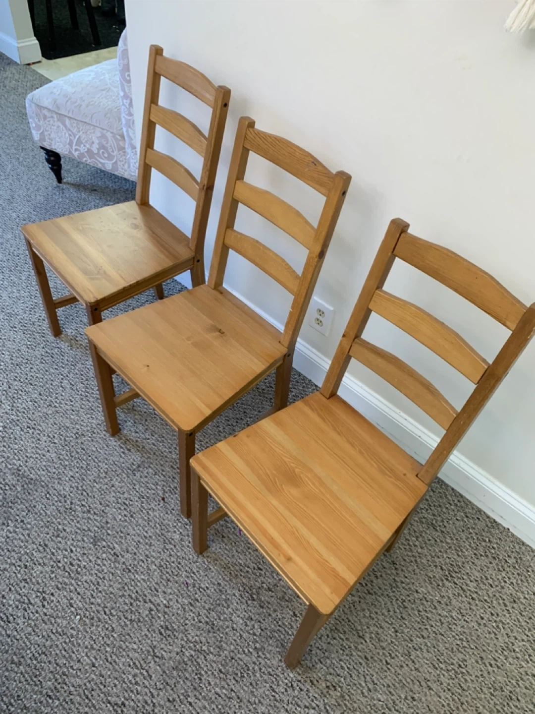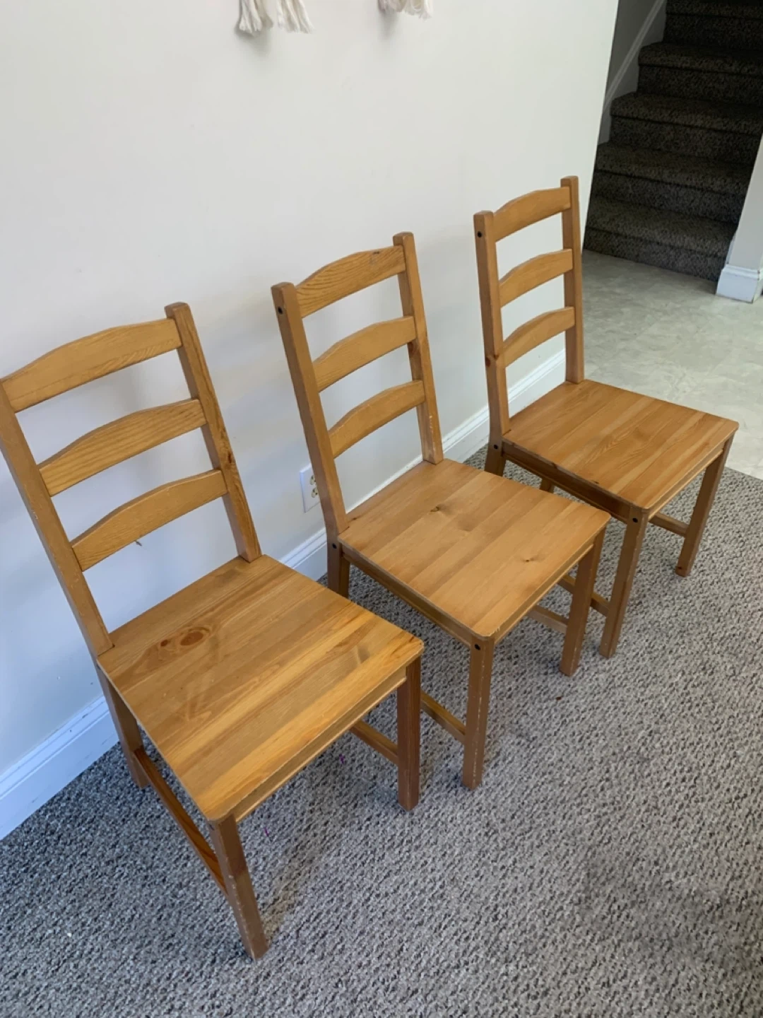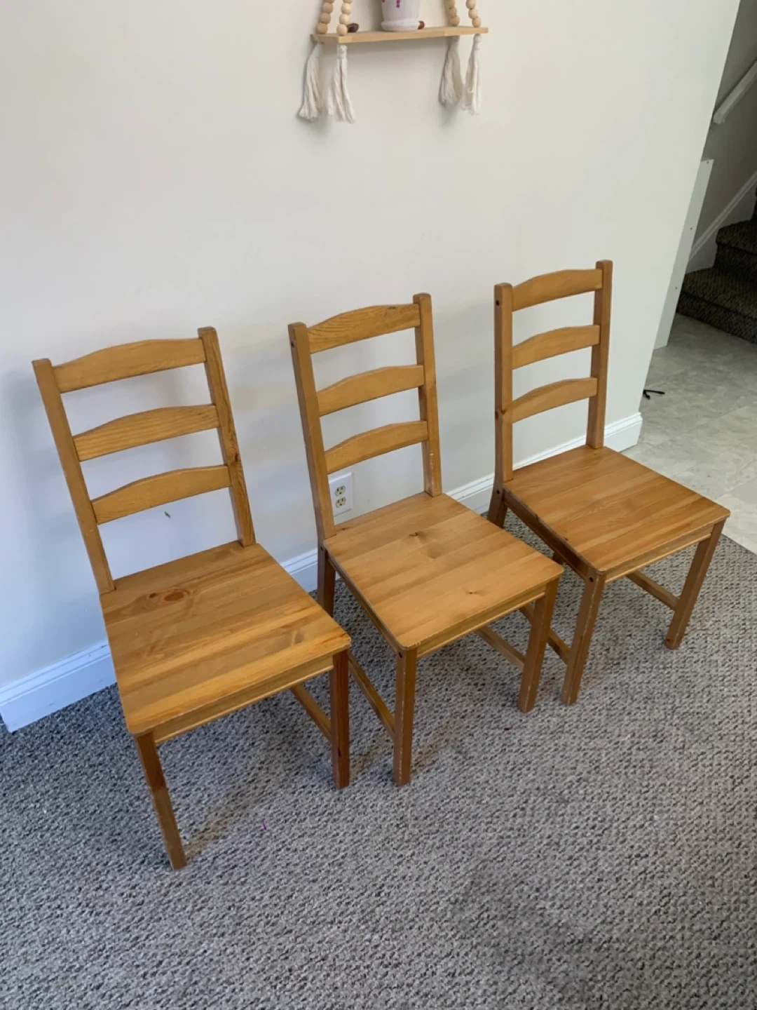 Selling a set of three wooden chairs. They're sturdy and would be great for a dining room or kitchen. They have a natural wood finish.