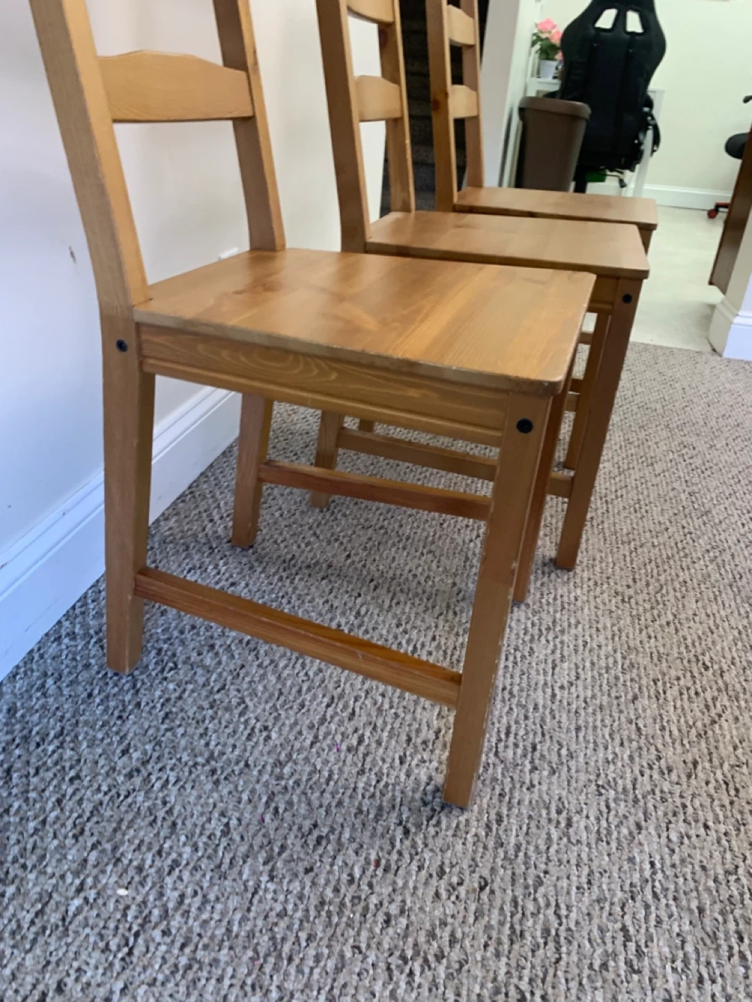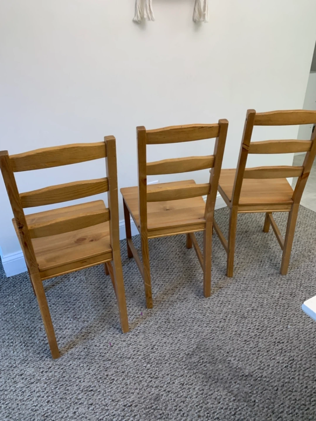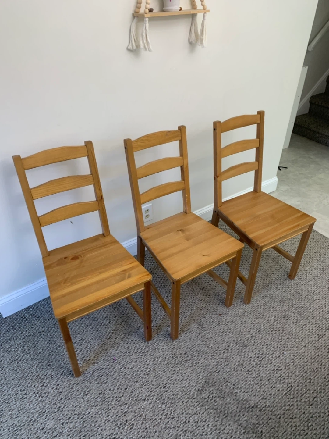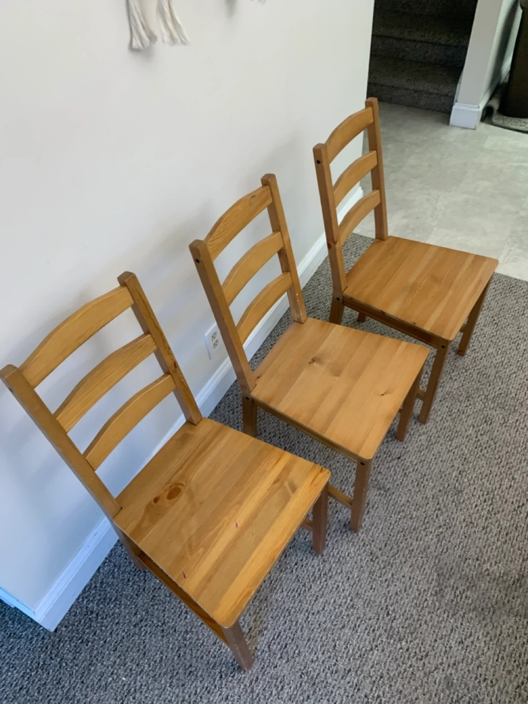 Selling a set of three wooden chairs. They're sturdy and would be great for a dining room or kitchen. They have a natural wood finish.