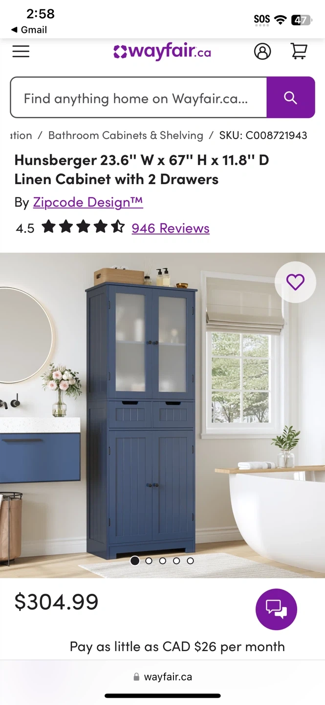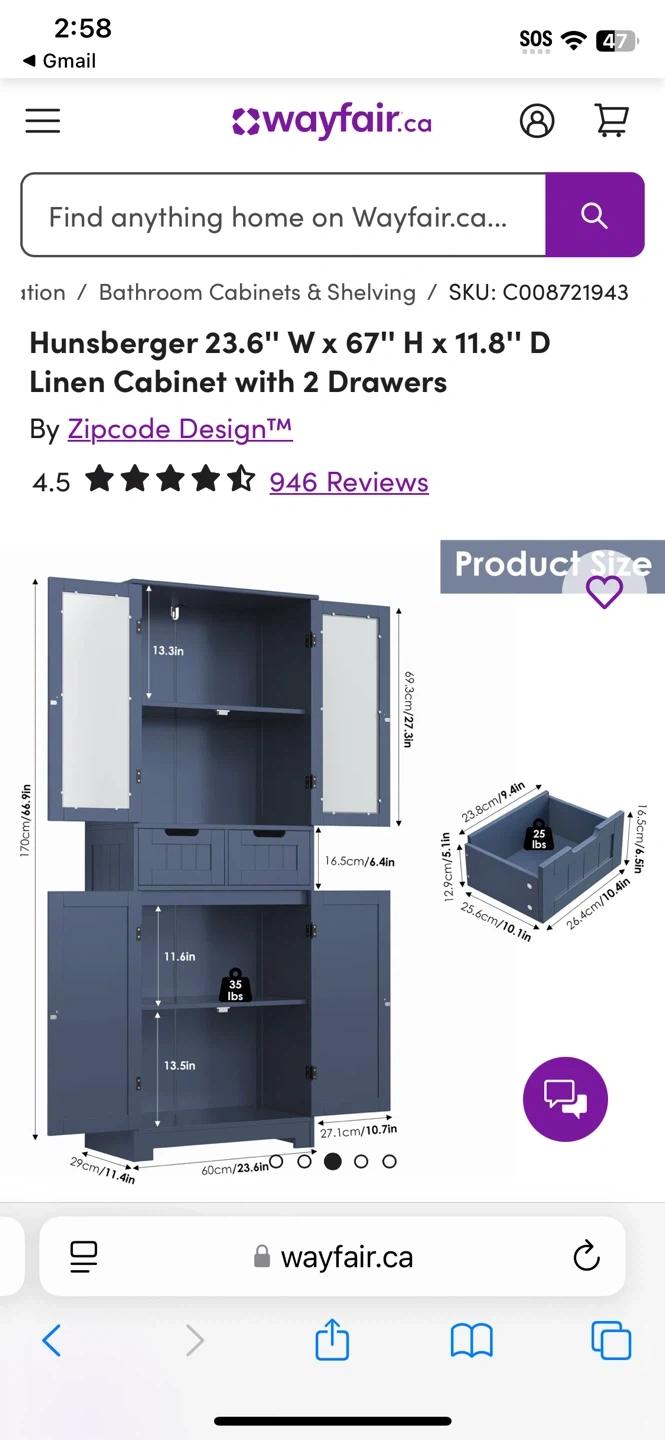 Selling a Zipcode Design Hunsberger linen cabinet with two drawers. It's 23.6" W x 67" H x 11.8" D.
