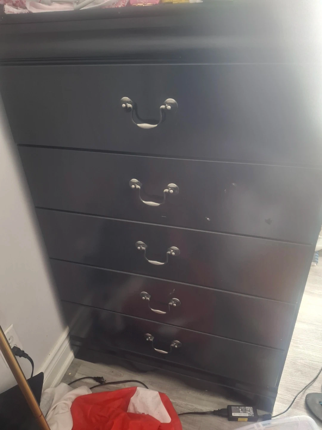 Selling a black dresser with five drawers! It's a great piece for adding storage to any room. The dresser is in good condition and ready for a new home