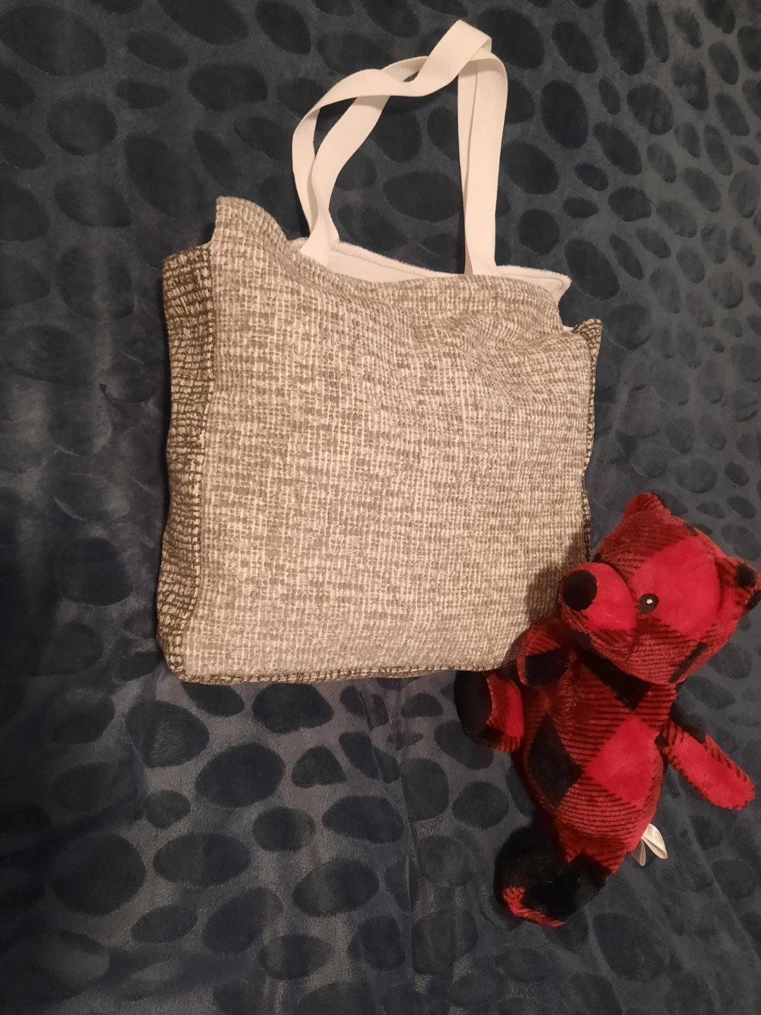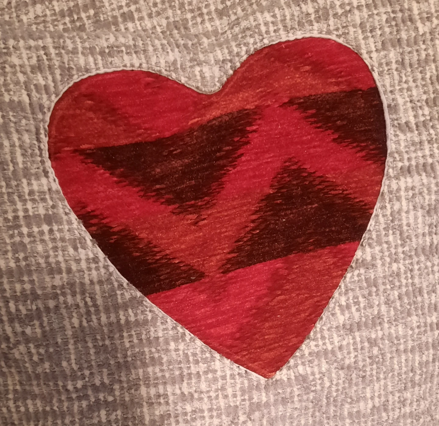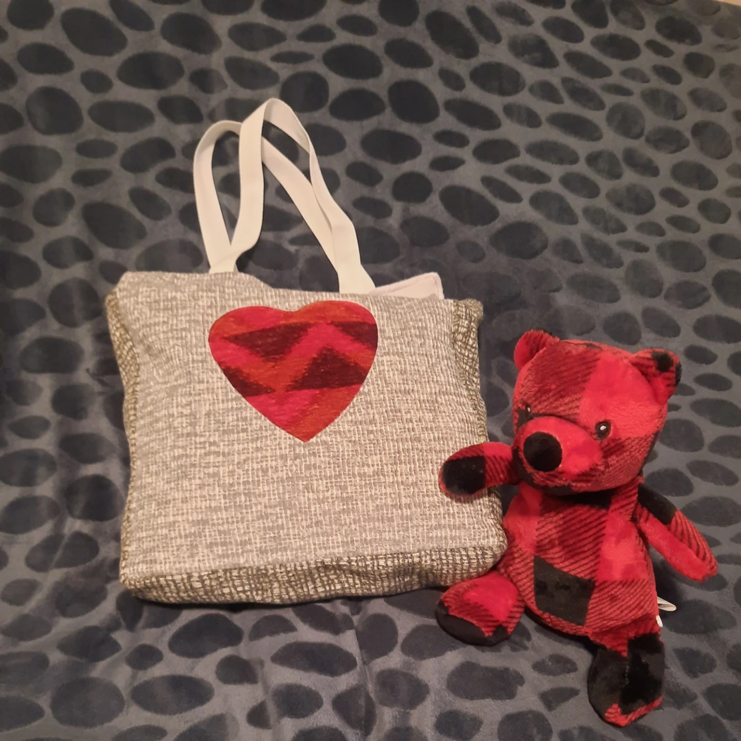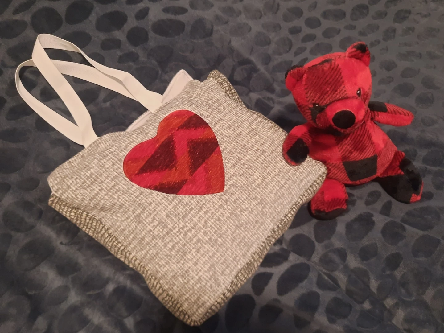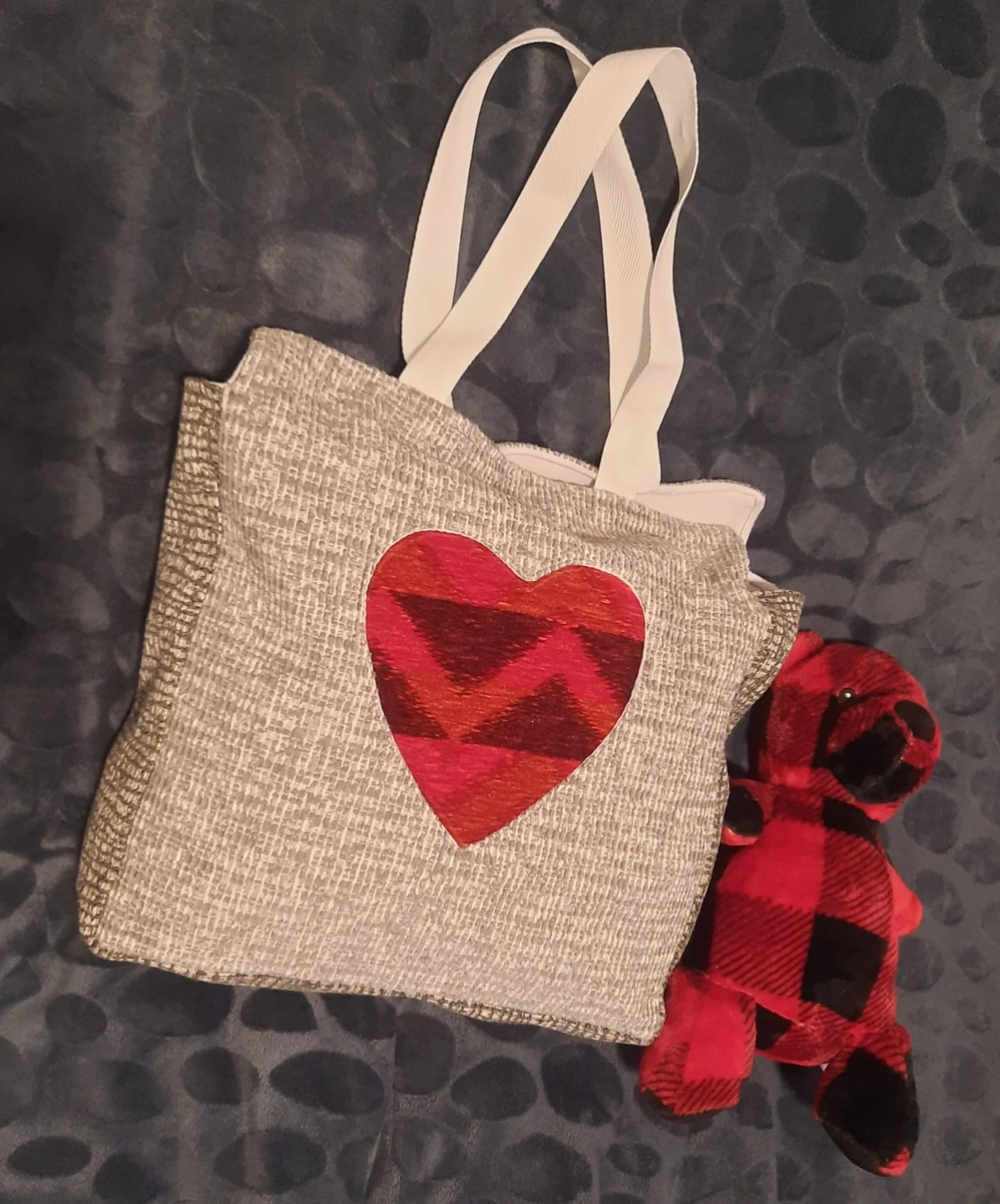 Here's a cute my handmade tote bag! It features a grey textured fabric with a red heart applique.