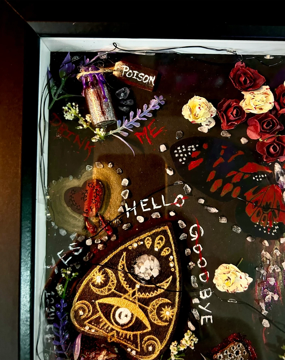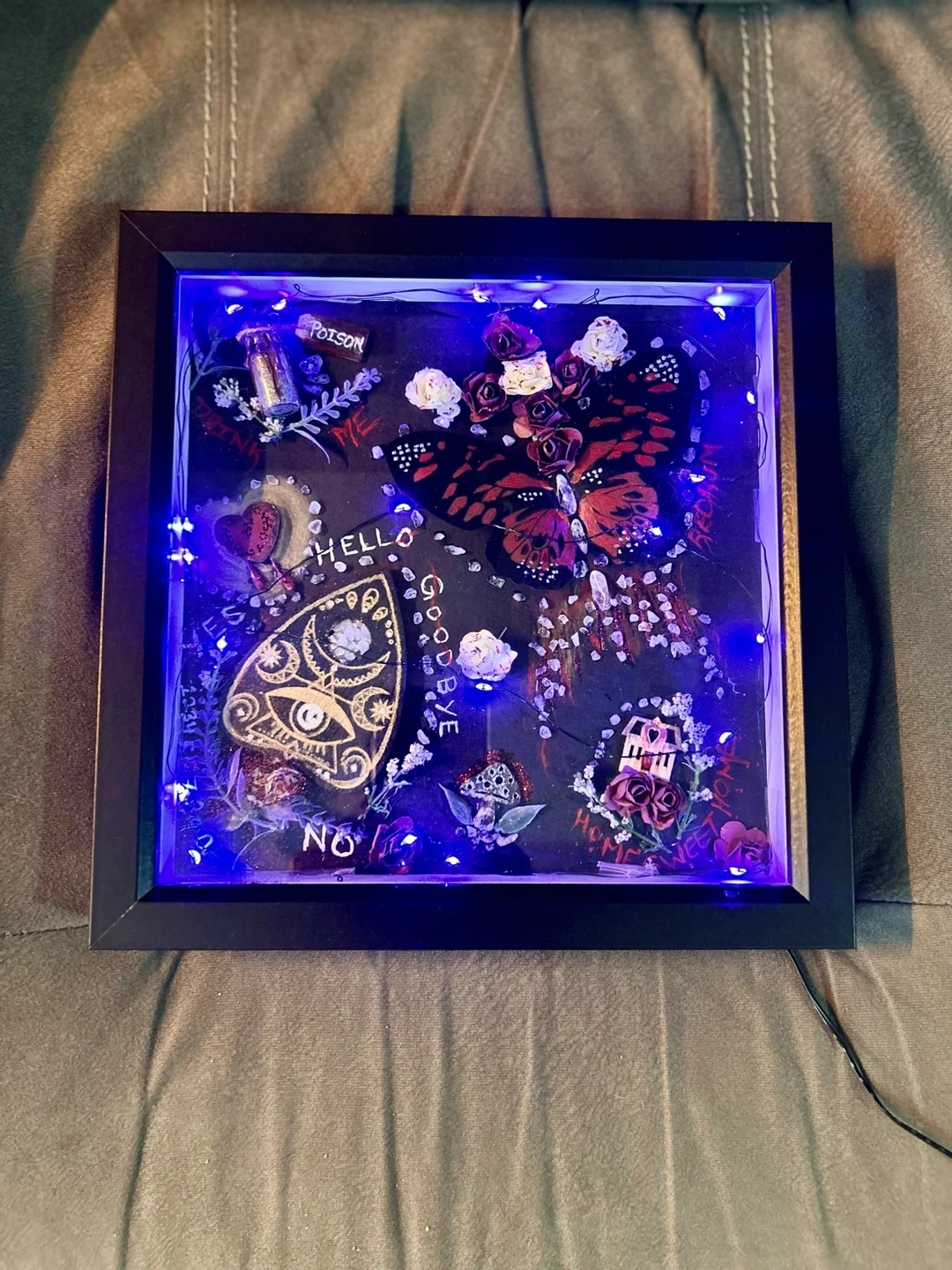 Handmade one-of-a-kind gothic shadow box artwork, featuring layered occult and dark romantic elements. This piece is fully enclosed in a deep shadow frame and includes working LED lights that give it an eerie glow when illuminated.