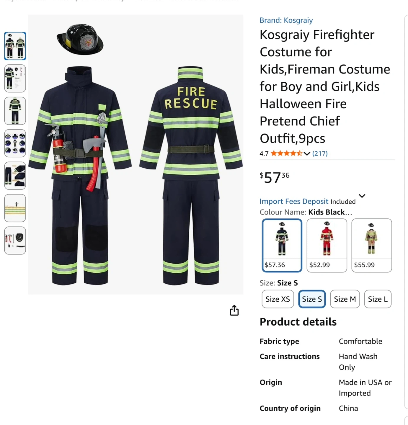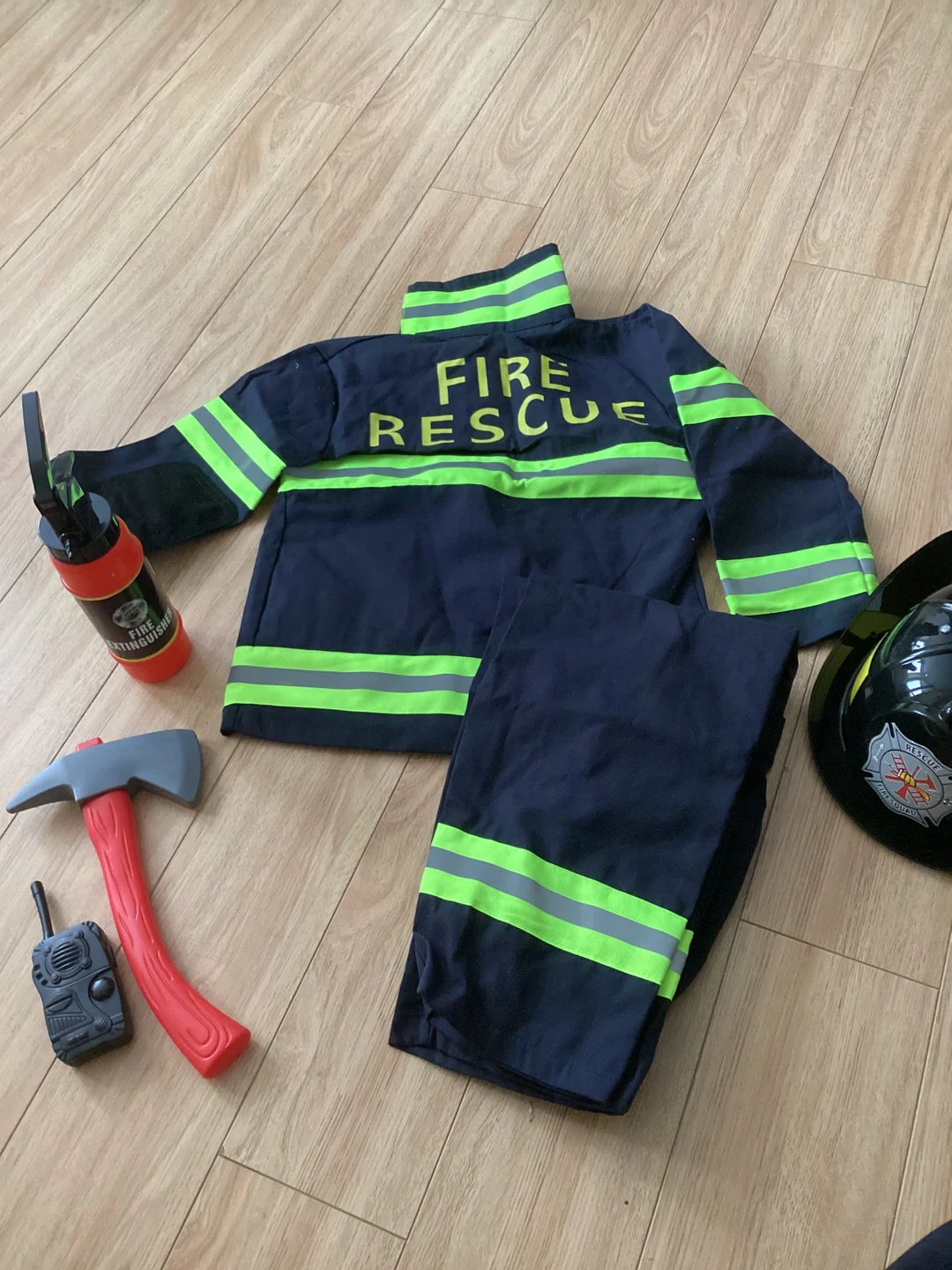 I'm selling a new firefighter costume for kids in size S (approx 3-5yrs)! It includes the jacket, pants, and helmet. Also comes with a toy fire extinguisher, walkie talkie, and axe! This costume is perfect for dress-up, and hours of fun! Quality cotton uniform!