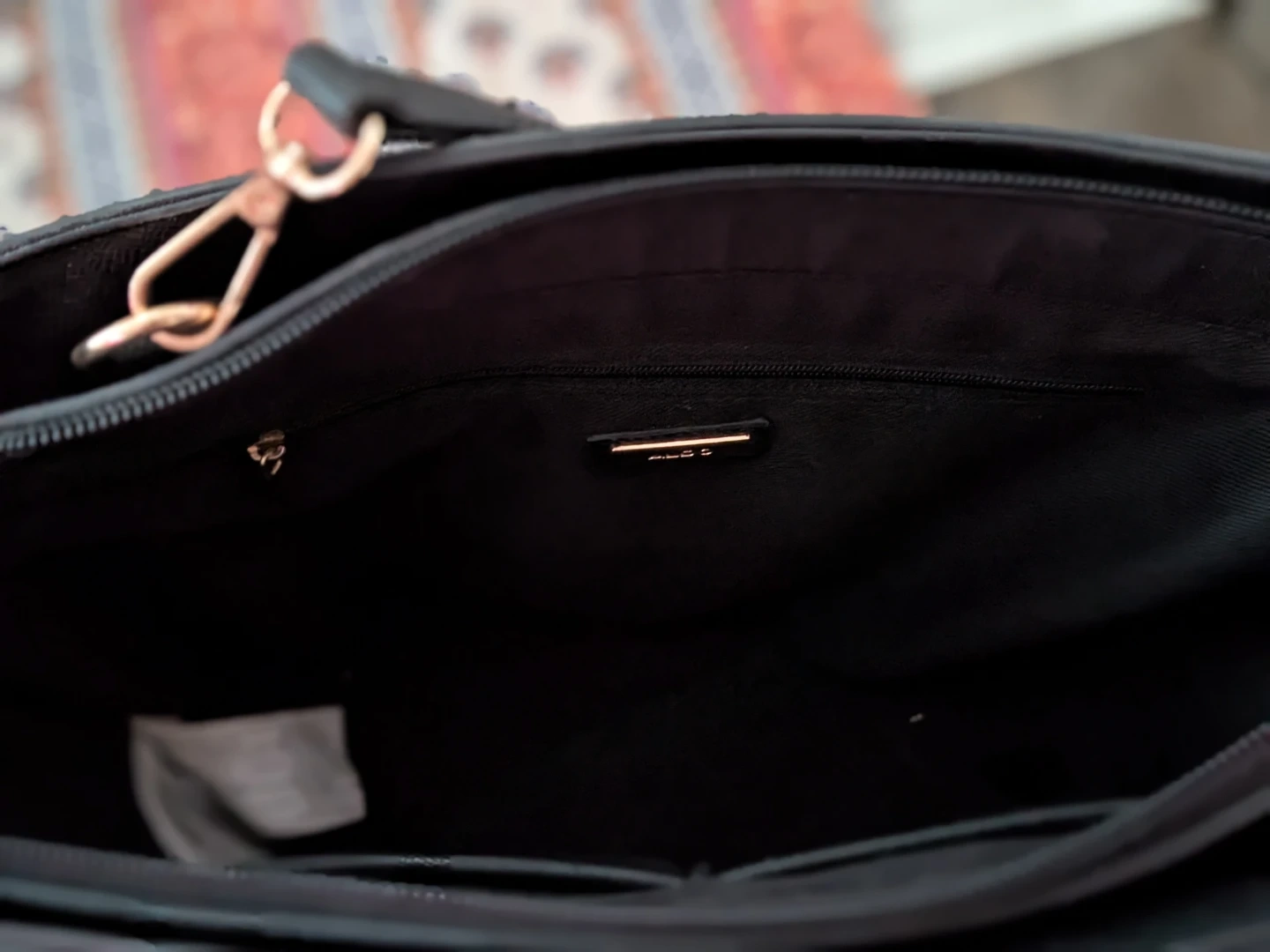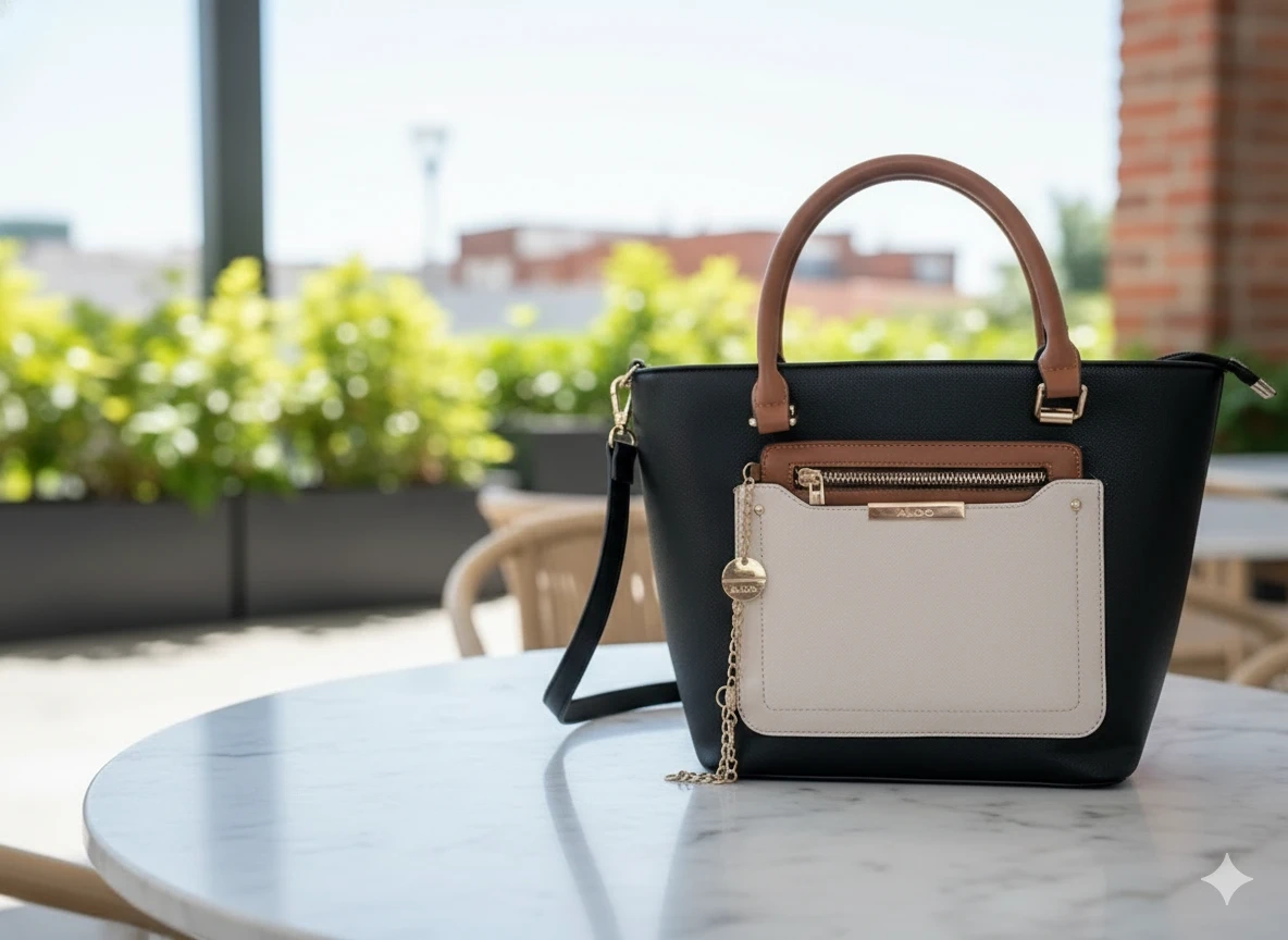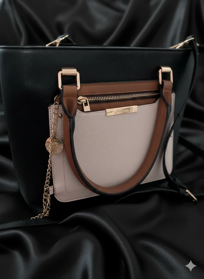 Stylish ALDO perimma handbag in a combination of black and beige. It features a structured design with contrasting handles and a detachable shoulder strap. Great for everyday use!