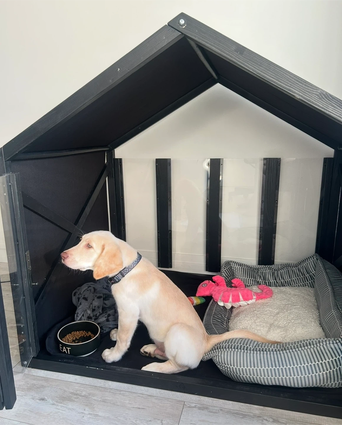 Selling a modern dog house in black with clear doors! It's a stylish and comfy space for your furry friend. The design is super sleek and would look great in any home. It's in great condition and ready for a new pup to call it home