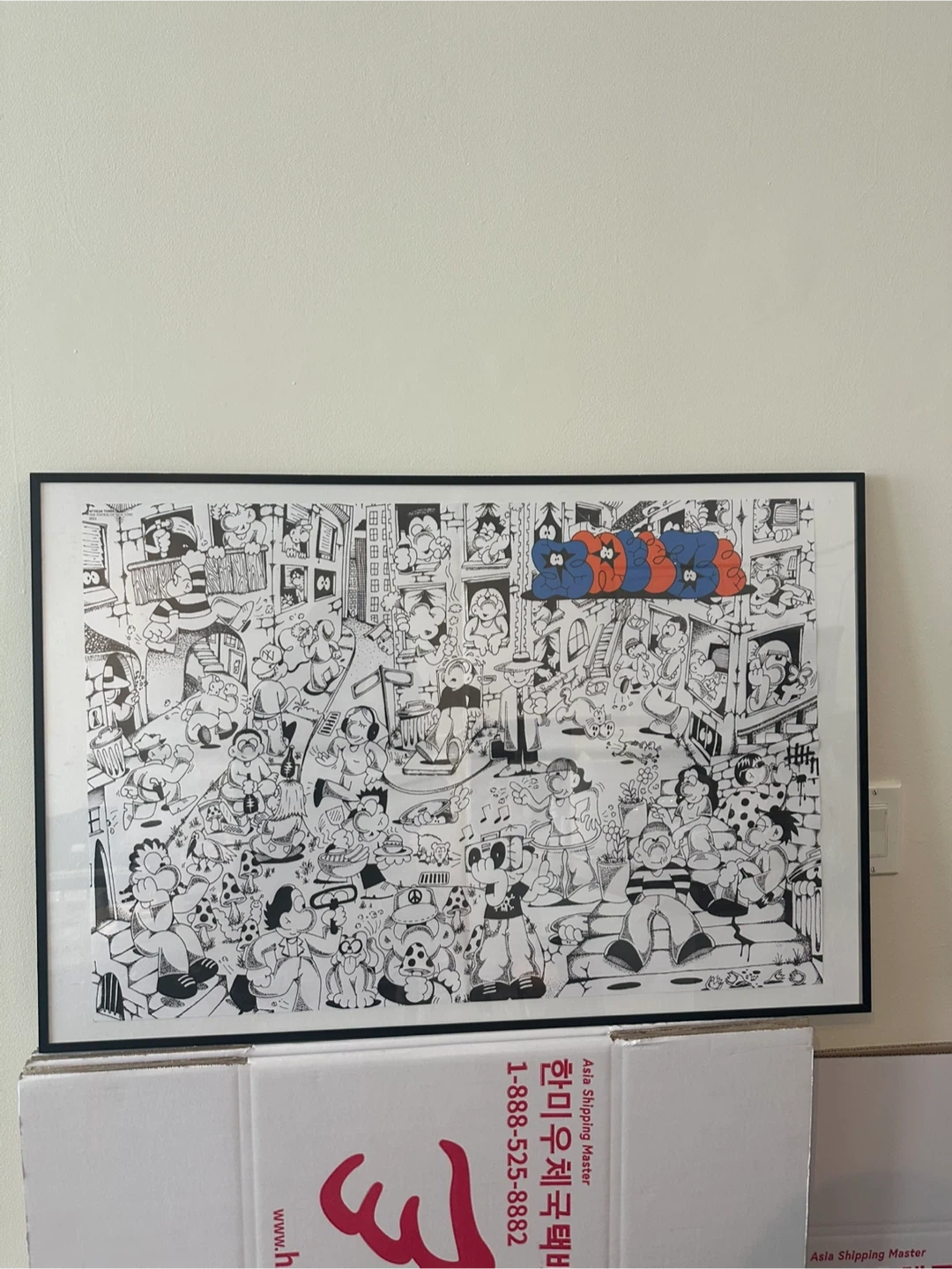 Selling a framed art print featuring a fun cartoon scene! The artwork is black and white with a few pops of colour. It's in great condition and ready to brighten up any room