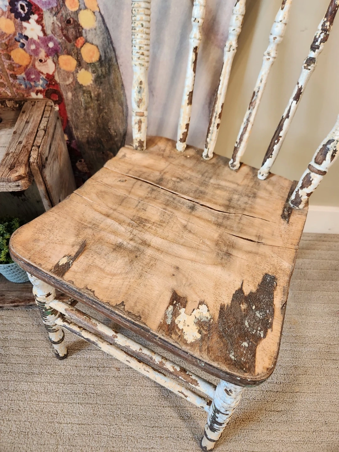 This antique treasure tells a hundred stories of people, family and love. This piece has baucoup character and rustic cottagecore and farmhouse charm. Use it as a plant stand, photography shoots or spare seating, it's sturdy and stylish! Seat surface is 15x15 and 17 inches high. Top of chair back is 32 inches high.