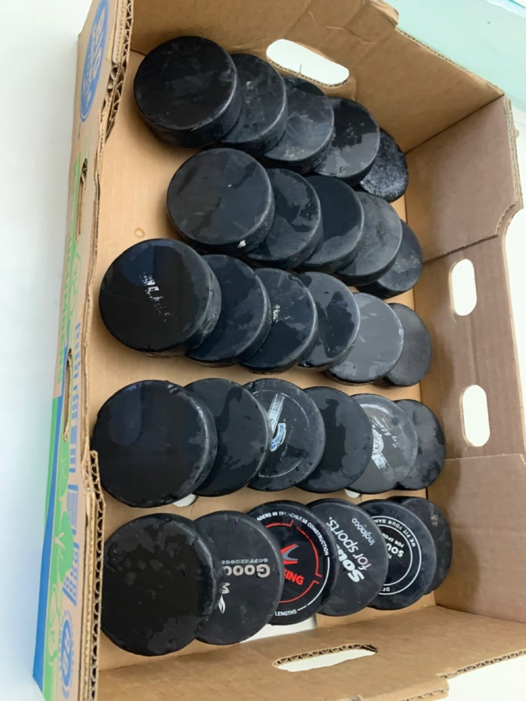 Selling a box of used hockey pucks. Great for practice or recreational play! They show some signs of use but are still in good condition for hitting the ice