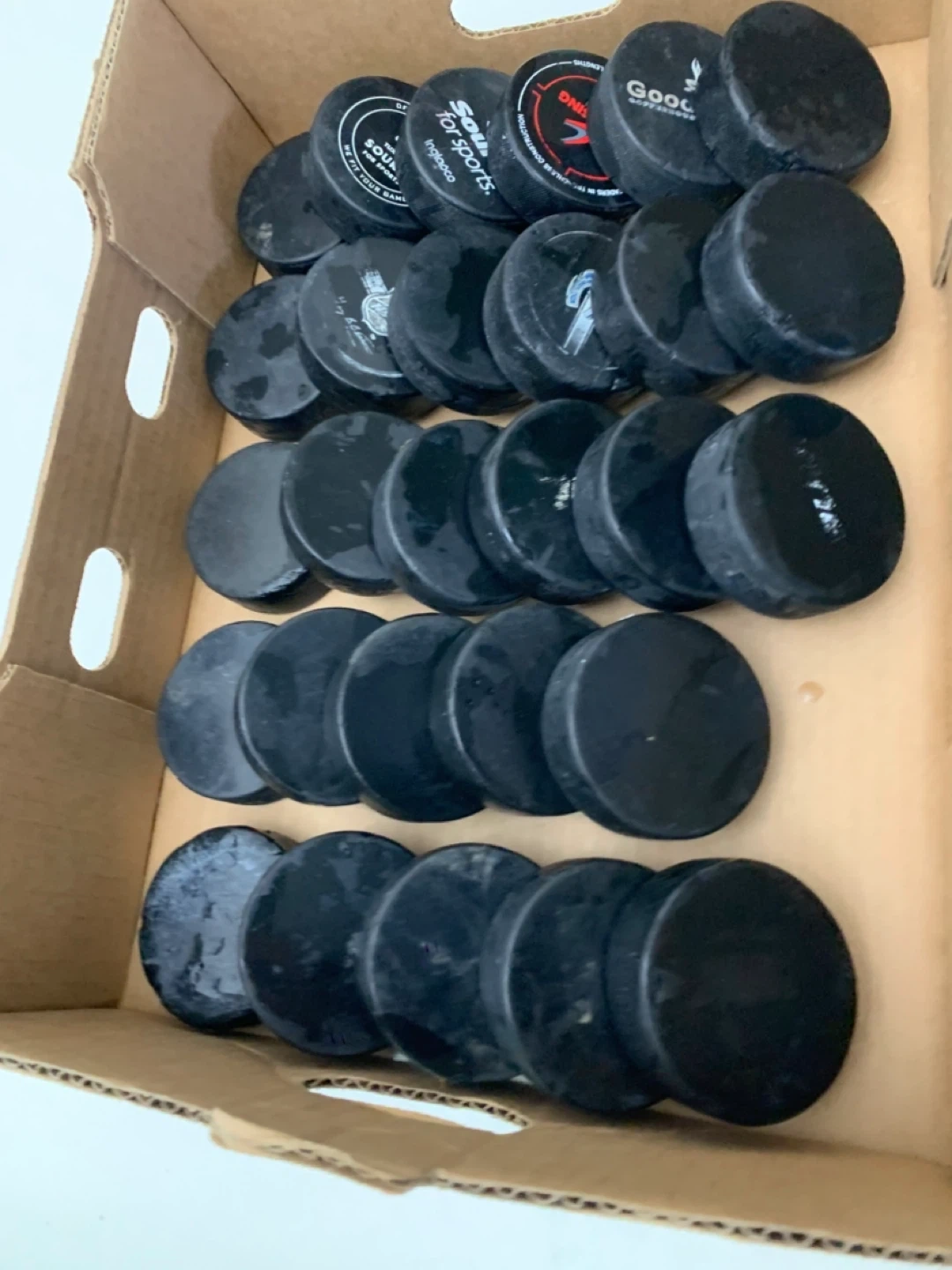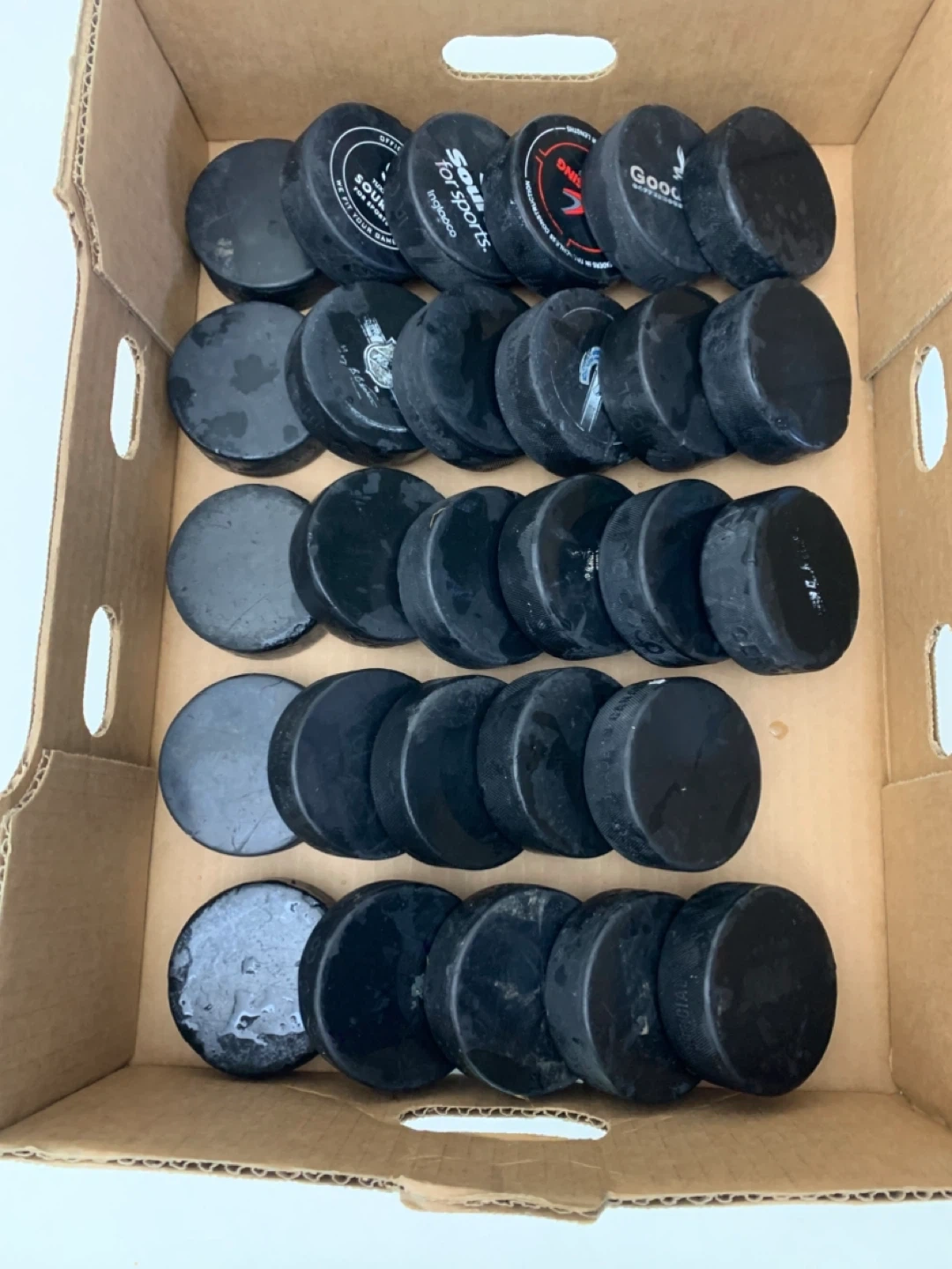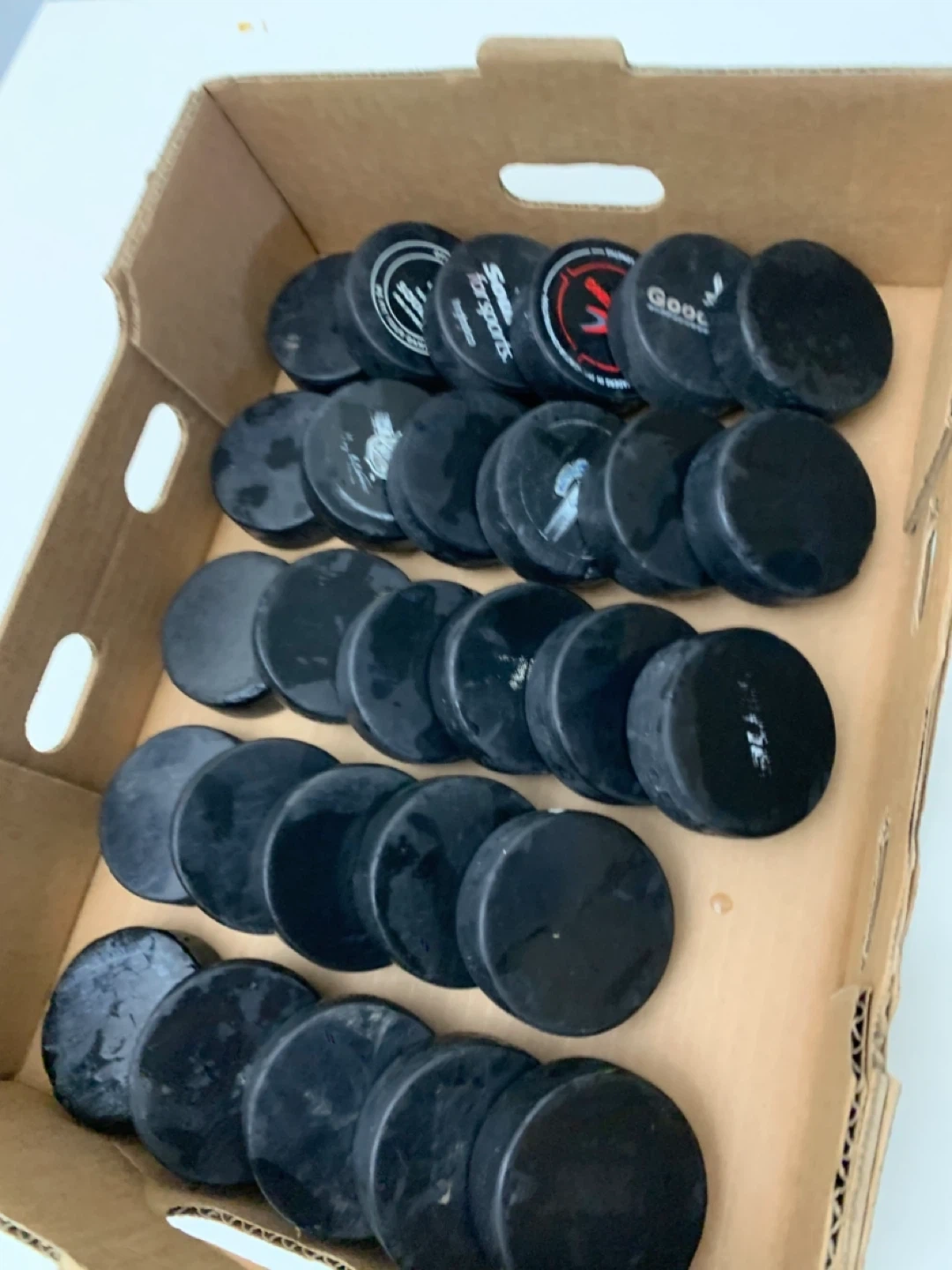 Selling a box of used hockey pucks. Great for practice or recreational play! They show some signs of use but are still in good condition for hitting the ice