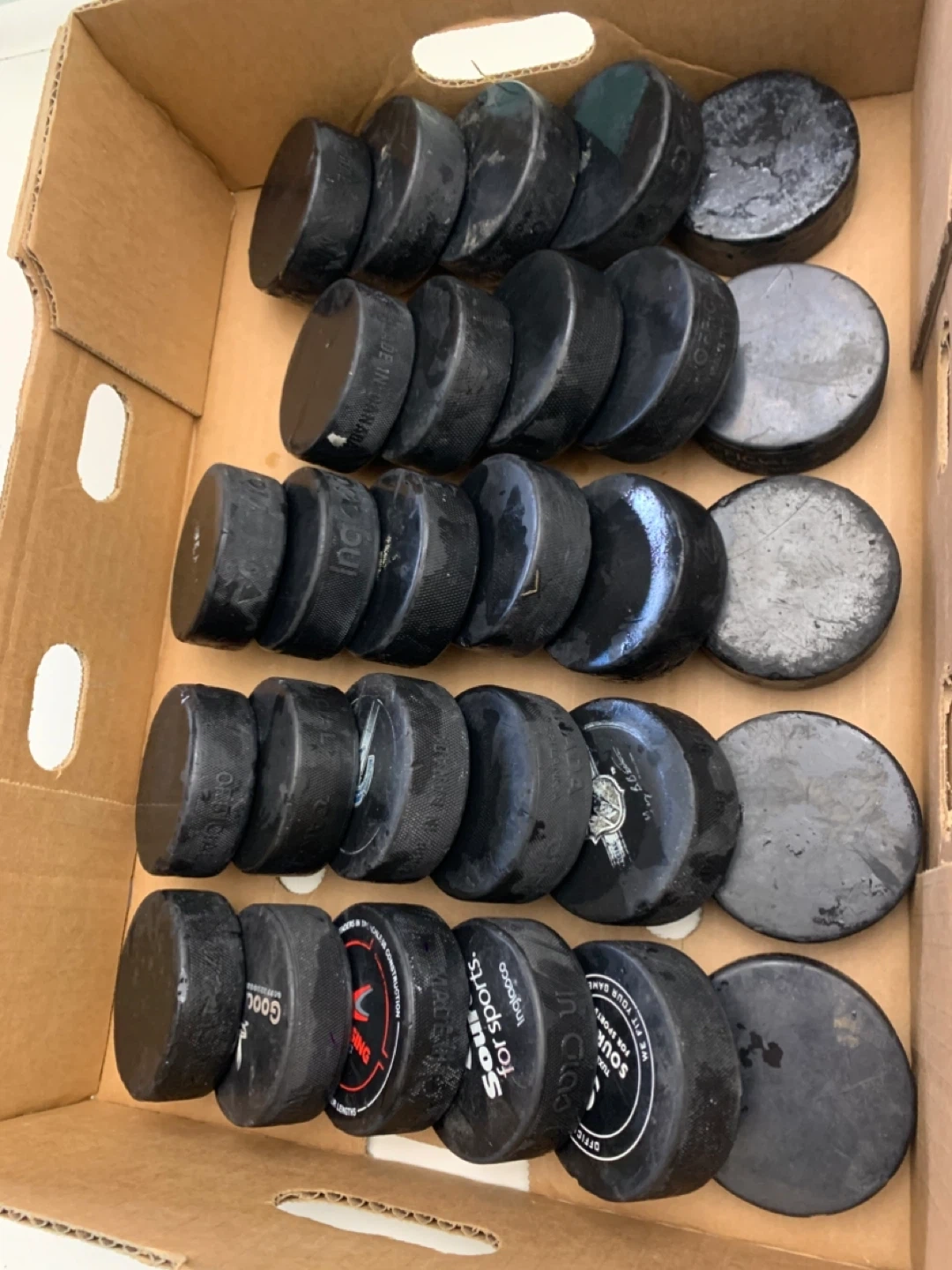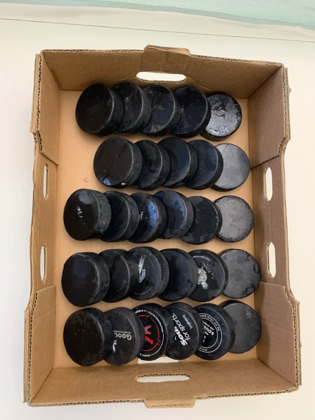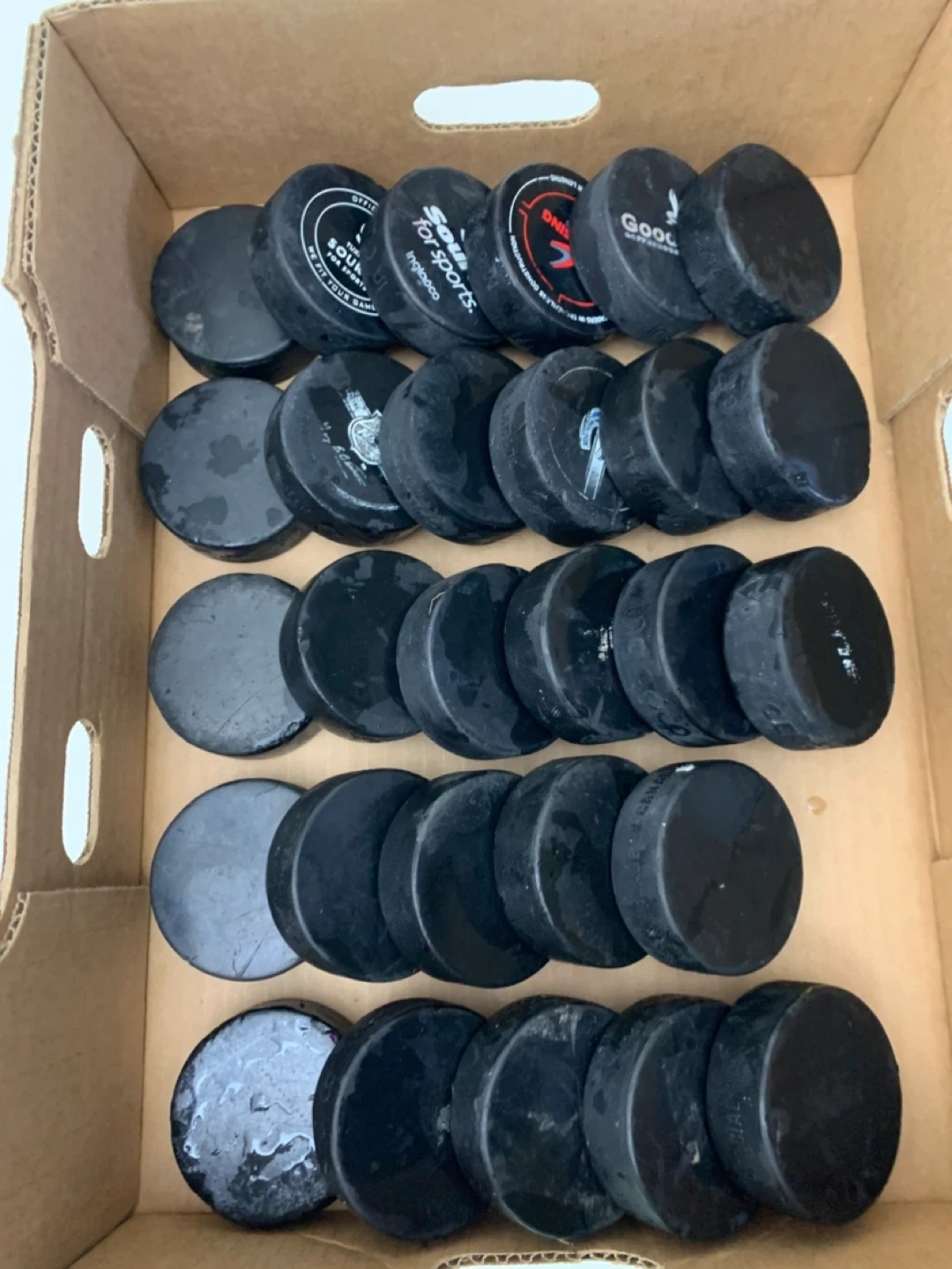 Selling a box of used hockey pucks. Great for practice or recreational play! They show some signs of use but are still in good condition for hitting the ice