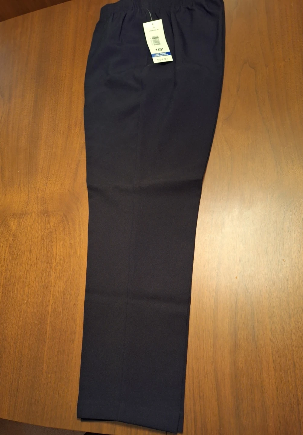 New with Tags Ladies Black Pull on Pants size 10 petite. Pants are 100% Polyester.