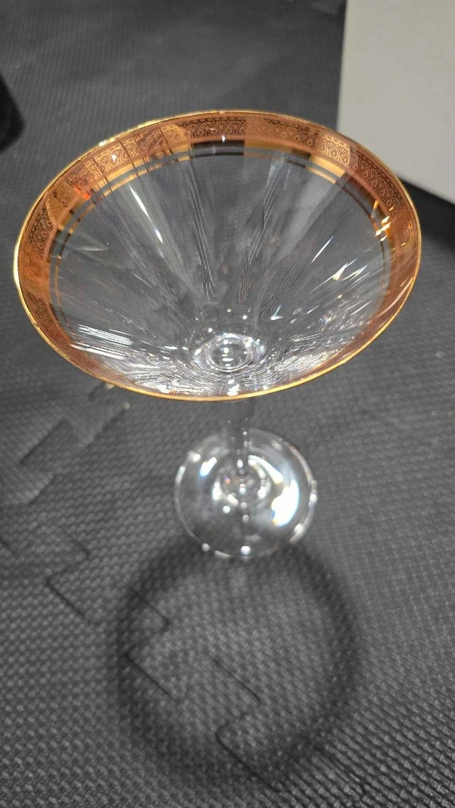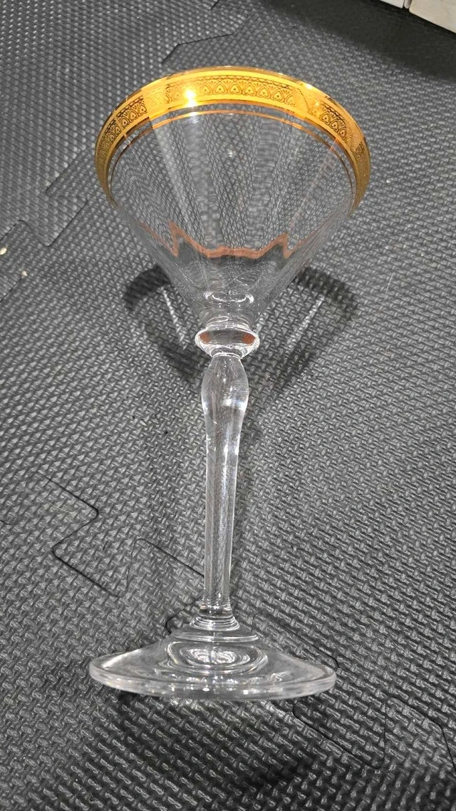 Elevate your cocktail experience with this set of 6 vintage Mikasa Palatial Gold martini glasses. These glasses feature a stunning gold rim and a classic martini shape, perfect for adding a touch of elegance to any gathering. This set is used and in good condition, ready to bring a sophisticated flair to your home bar.