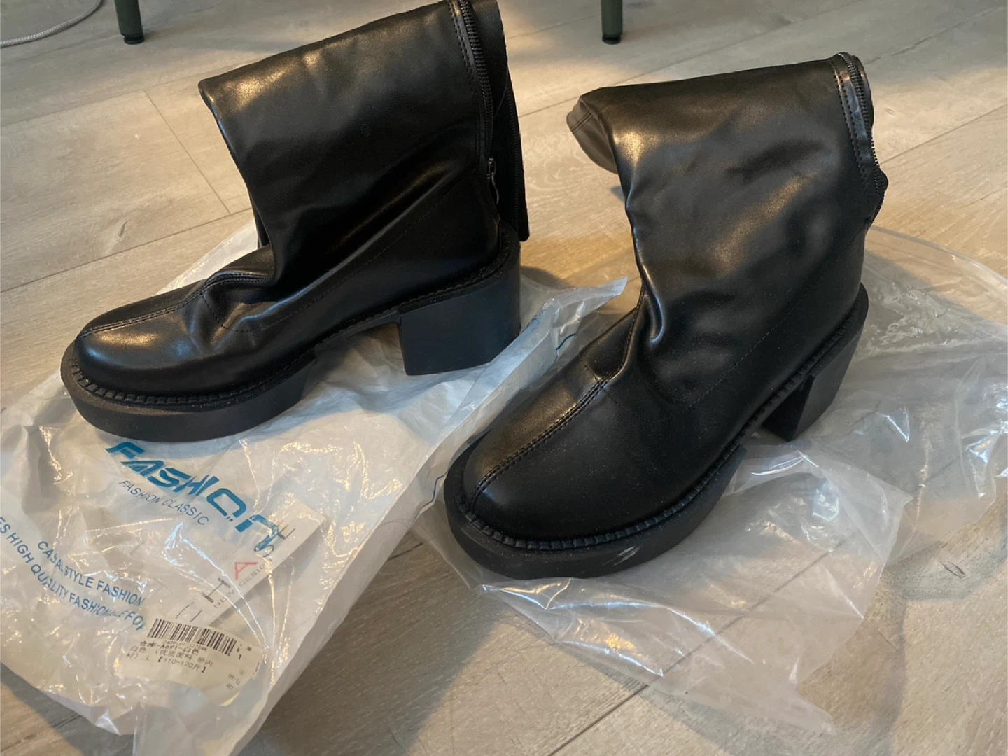 Selling a pair of black Fashion Style boots. They have a chunky heel and a zipper at the back. Please see photos for condition! Selling because it fits better for shorter people (under 160cm). Size 6
