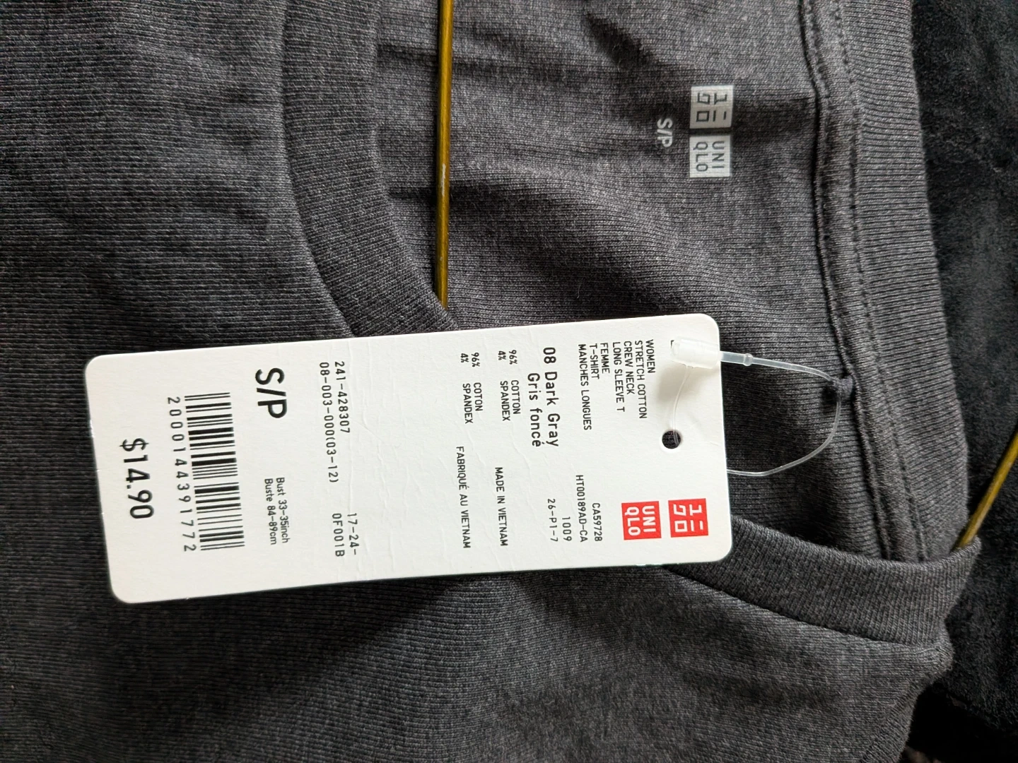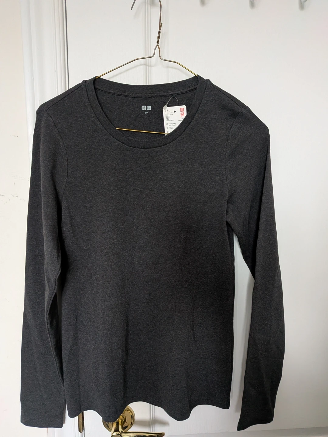 This is a brand new Uniqlo long sleeve top in dark gray, size small. It's made of 96% cotton and 4% spandex, so it's nice and comfy! The tag shows it was originally $14.90