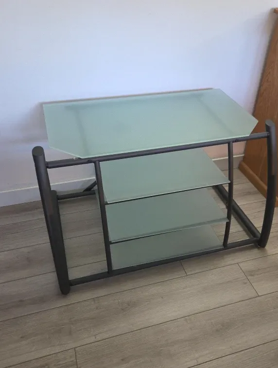 Here's a glass shelf TV stand that would be perfect for your living room or entertainment area! It has a sleek design with a metal frame and multiple glass shelves, providing ample space for your TV, media devices, and other decorative items. It's in great shape and ready to be picked up!
