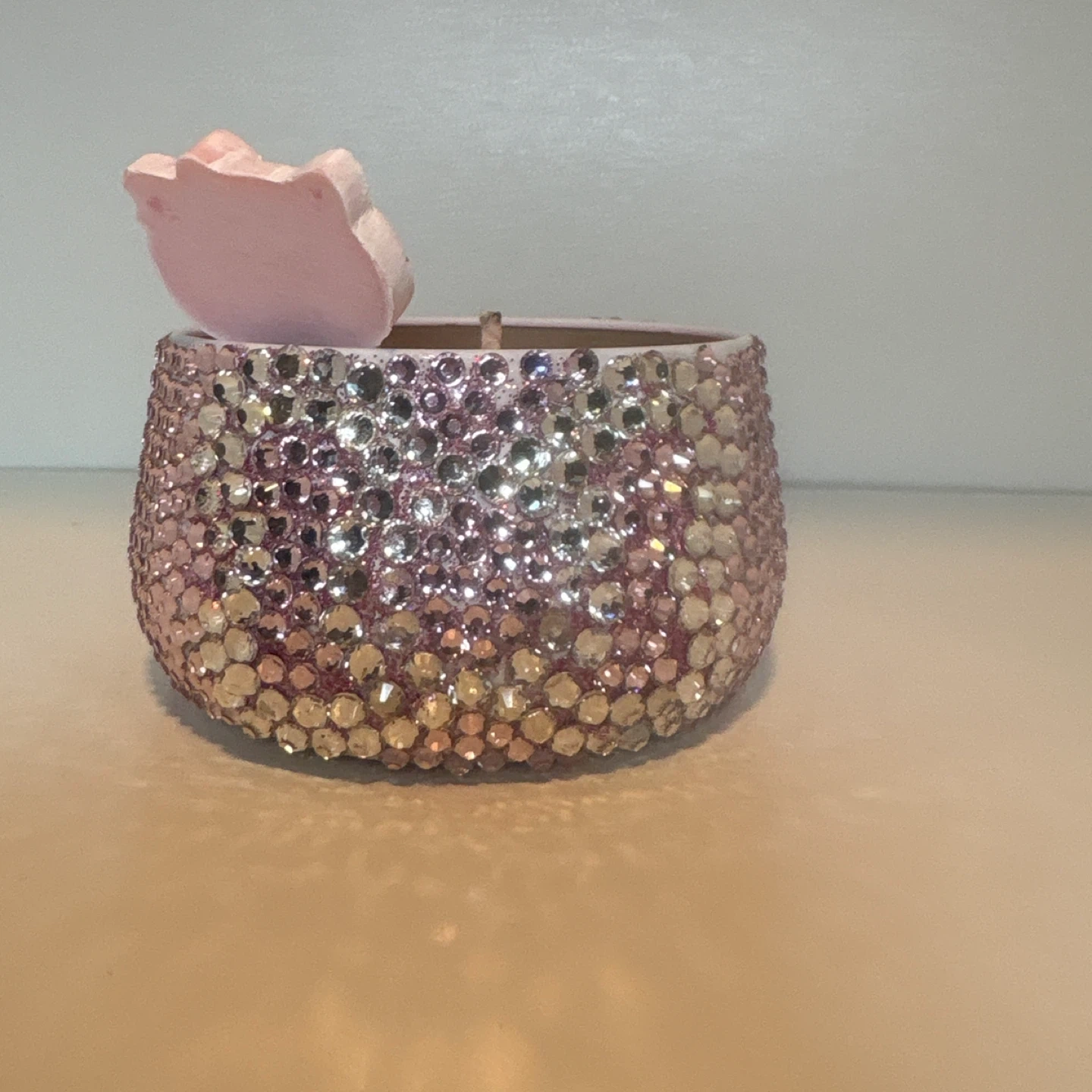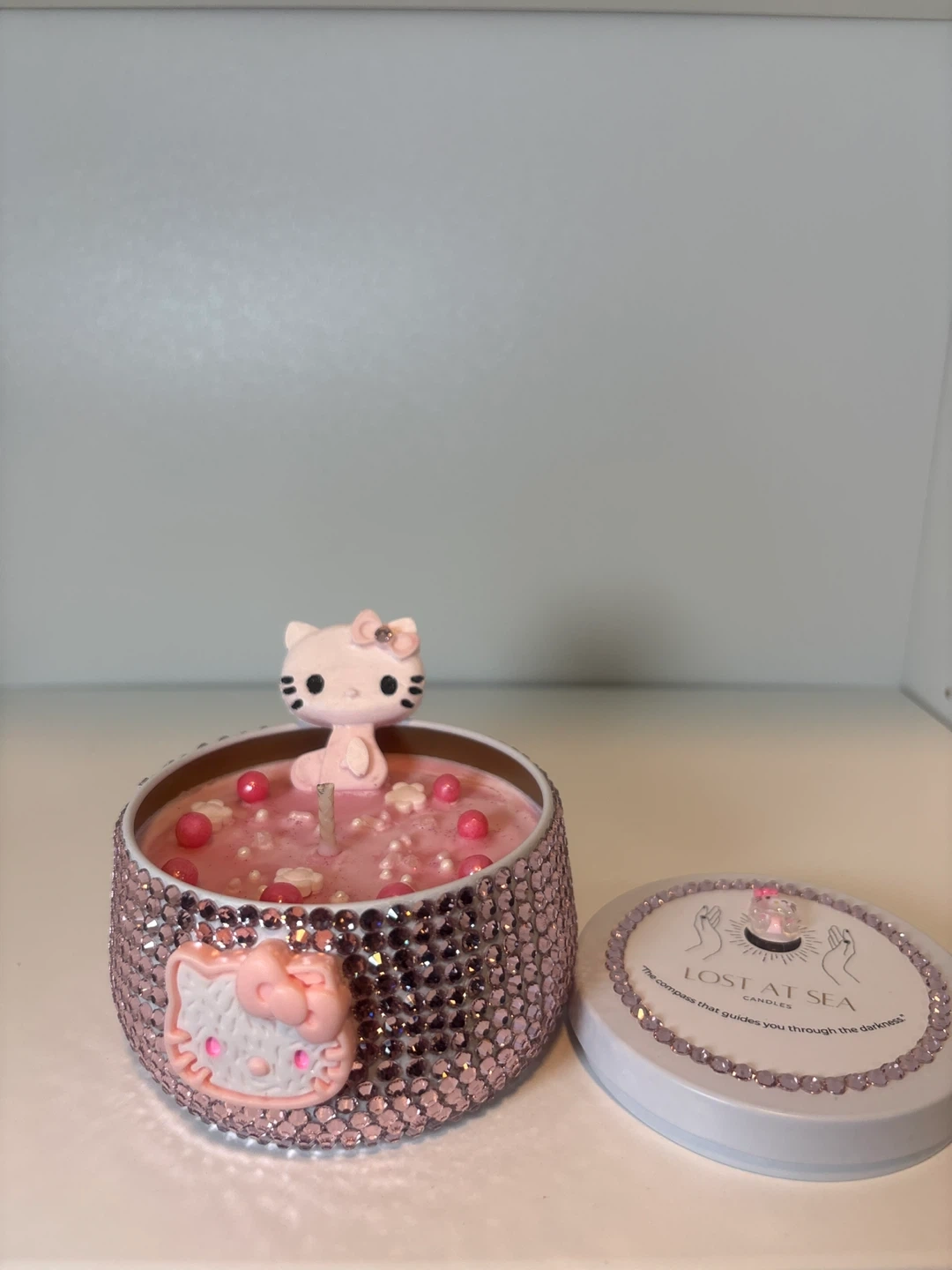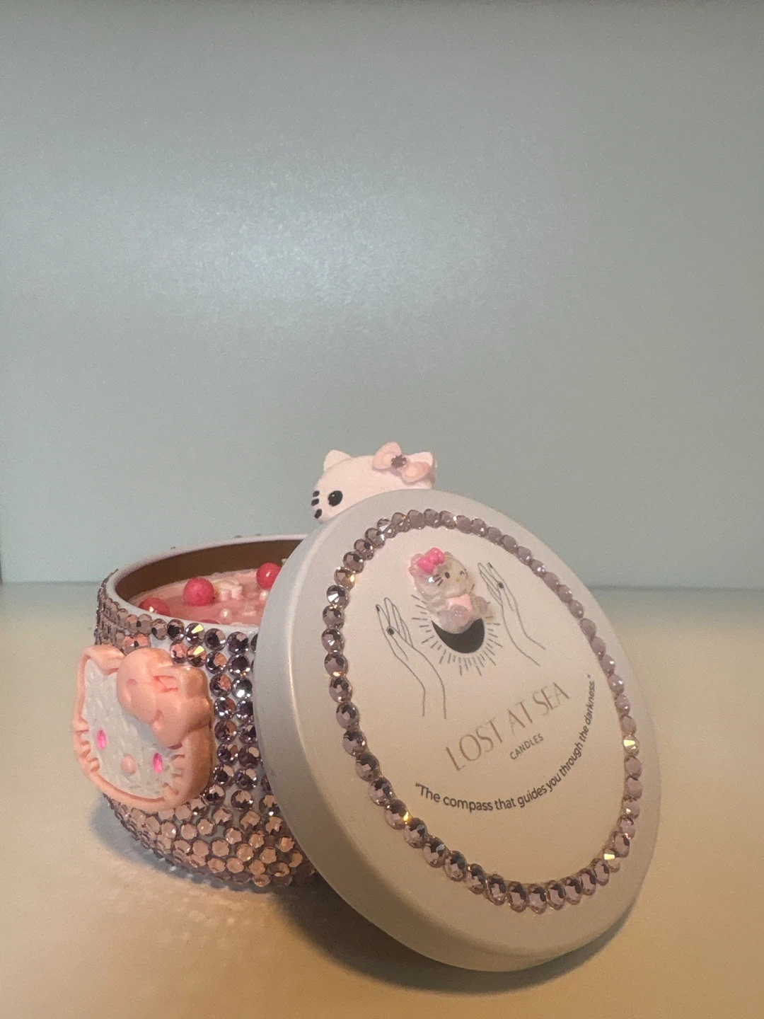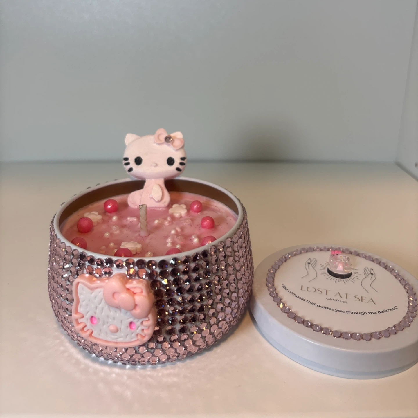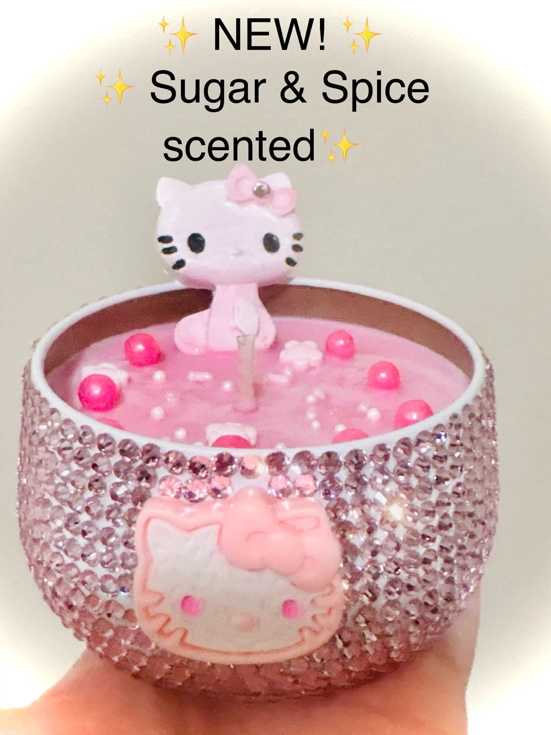 Sanrio Hello Kitty kawaii decorative candle with a sparkling rhinestone jar and sweet pastel design. Poured using 100% soy wax and a cotton wick for a clean, even burn.