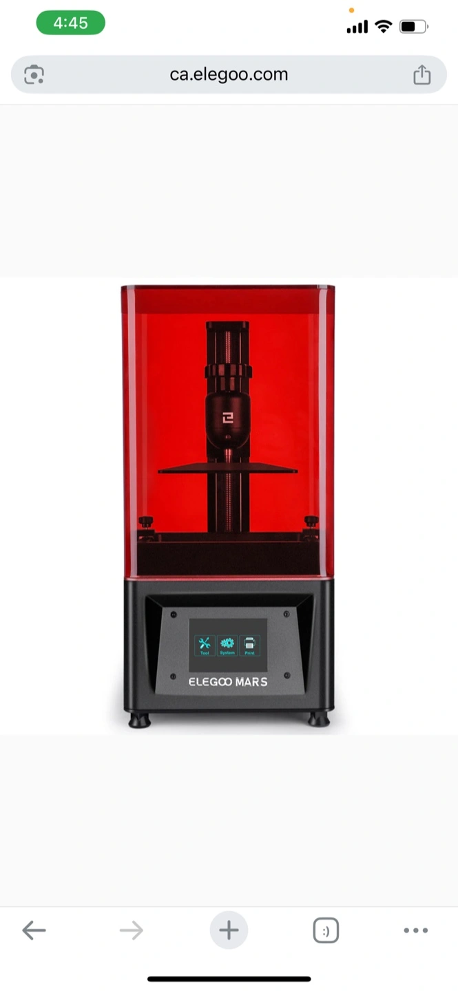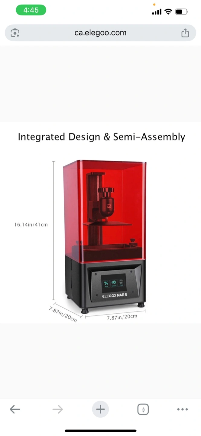 Selling an ELEGOO Mars 3D printer! It features an integrated design and comes semi-assembled. The dimensions are approximately 16.14 inches (41cm) in height and 7.87 inches (20cm) in width and depth. Great for starting your 3D printing journey.