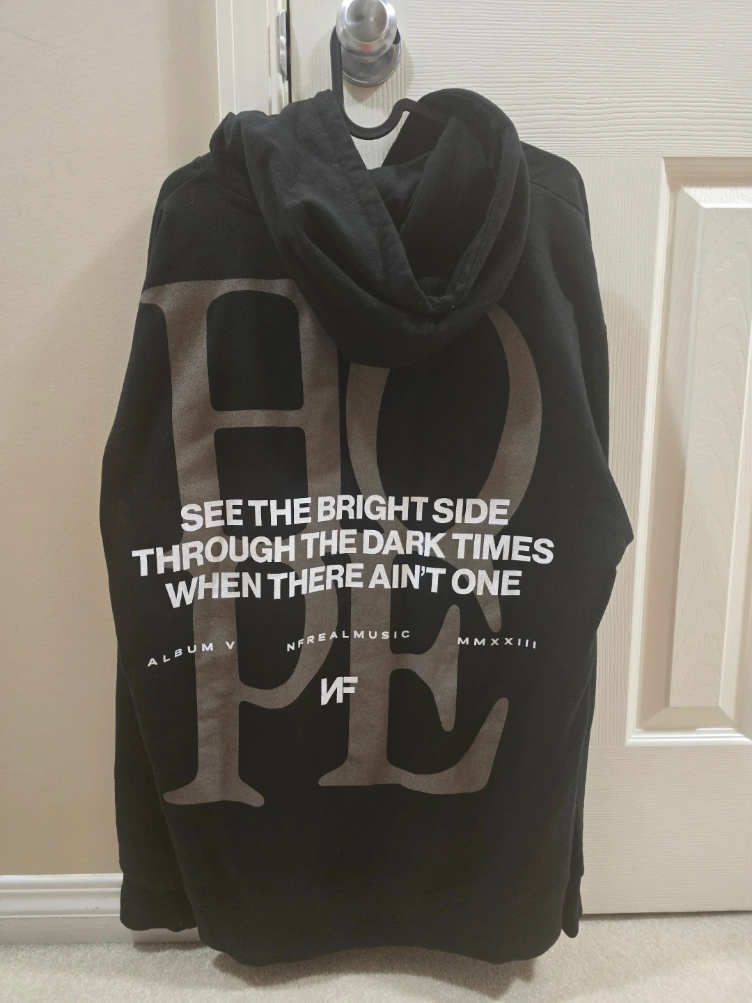 Selling a black NF Hope hoodie. The back features the words "SEE THE BRIGHT SIDE THROUGH THE DARK TIMES WHEN THERE AIN'T ONE". Album V NFREALMUSIC MMXXIII is also printed on the back. It's in great condition!