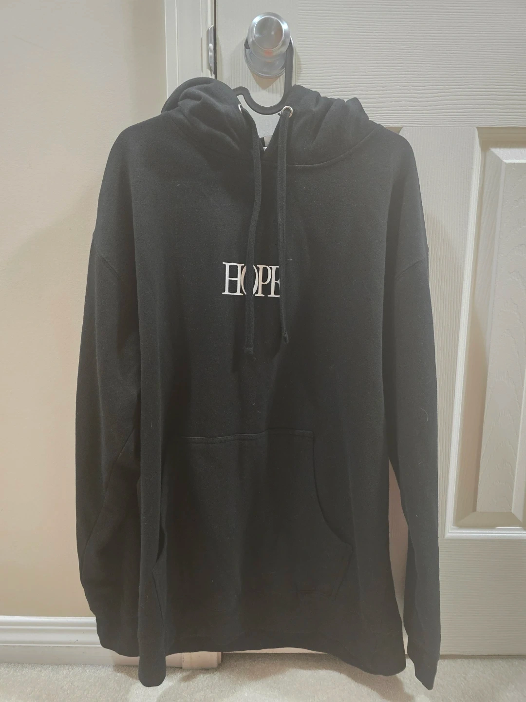 Selling a black NF Hope hoodie. The back features the words "SEE THE BRIGHT SIDE THROUGH THE DARK TIMES WHEN THERE AIN'T ONE". Album V NFREALMUSIC MMXXIII is also printed on the back. It's in great condition!
