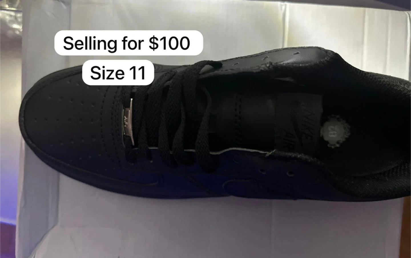 Selling a pair of Nike Air Force 1s in black, size 11. They come with the box! brand new and fresher and ready for our owner