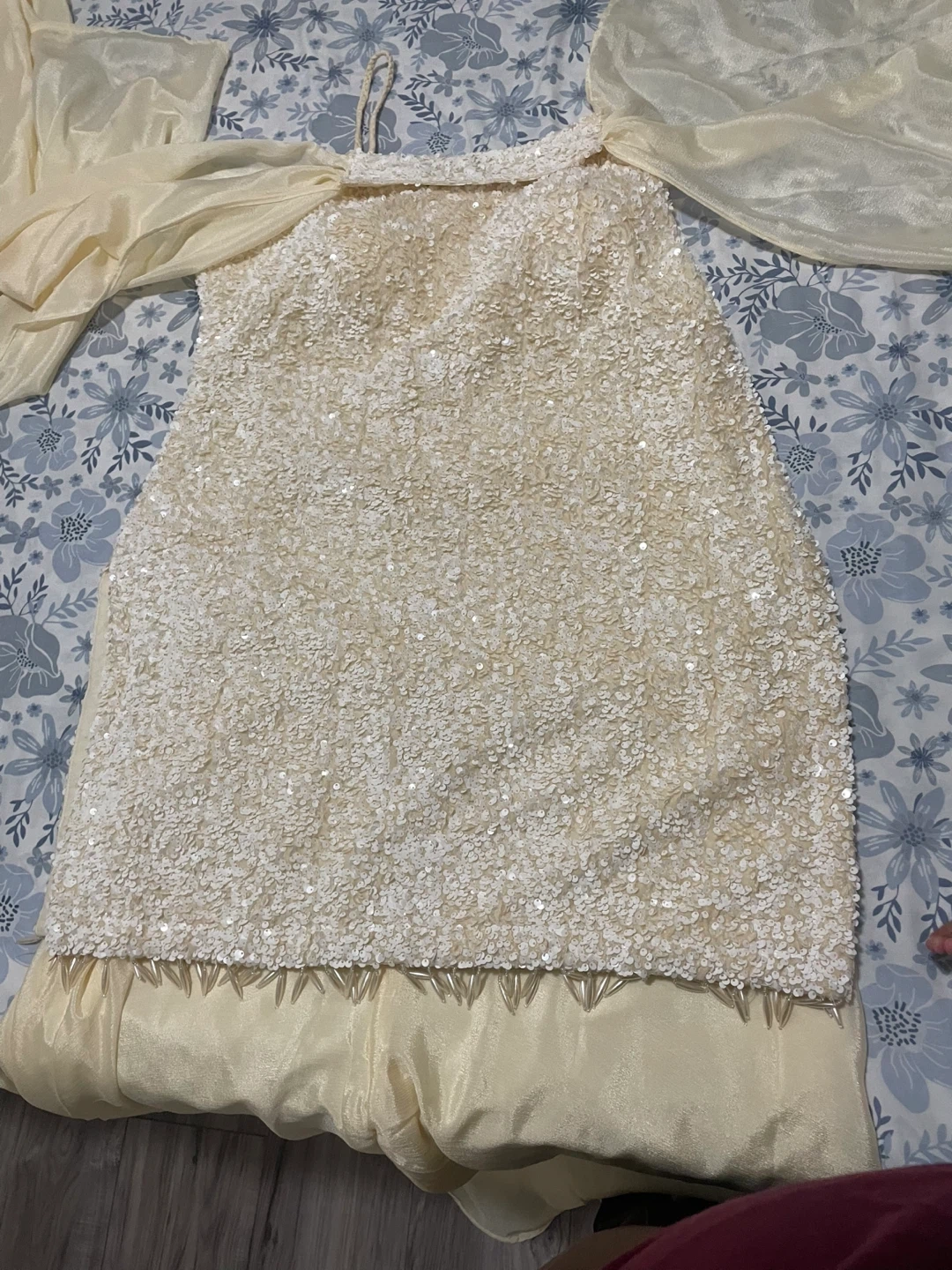 Selling a cream-coloured dress with beaded detailing. It's in good condition and has a unique, elegant look. Perfect for a special occasion or a night event!