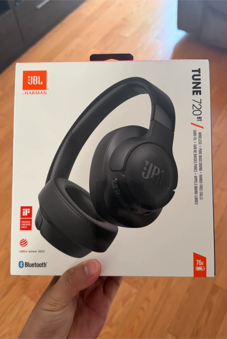 Selling a new pair of JBL Tune 720BT wireless headphones! These headphones are black and come in the original box. They feature pure bass sound and hands-free calls. They also have a lightweight and foldable design, making them easy to carry around. Enjoy up to 76 hours of playtime!