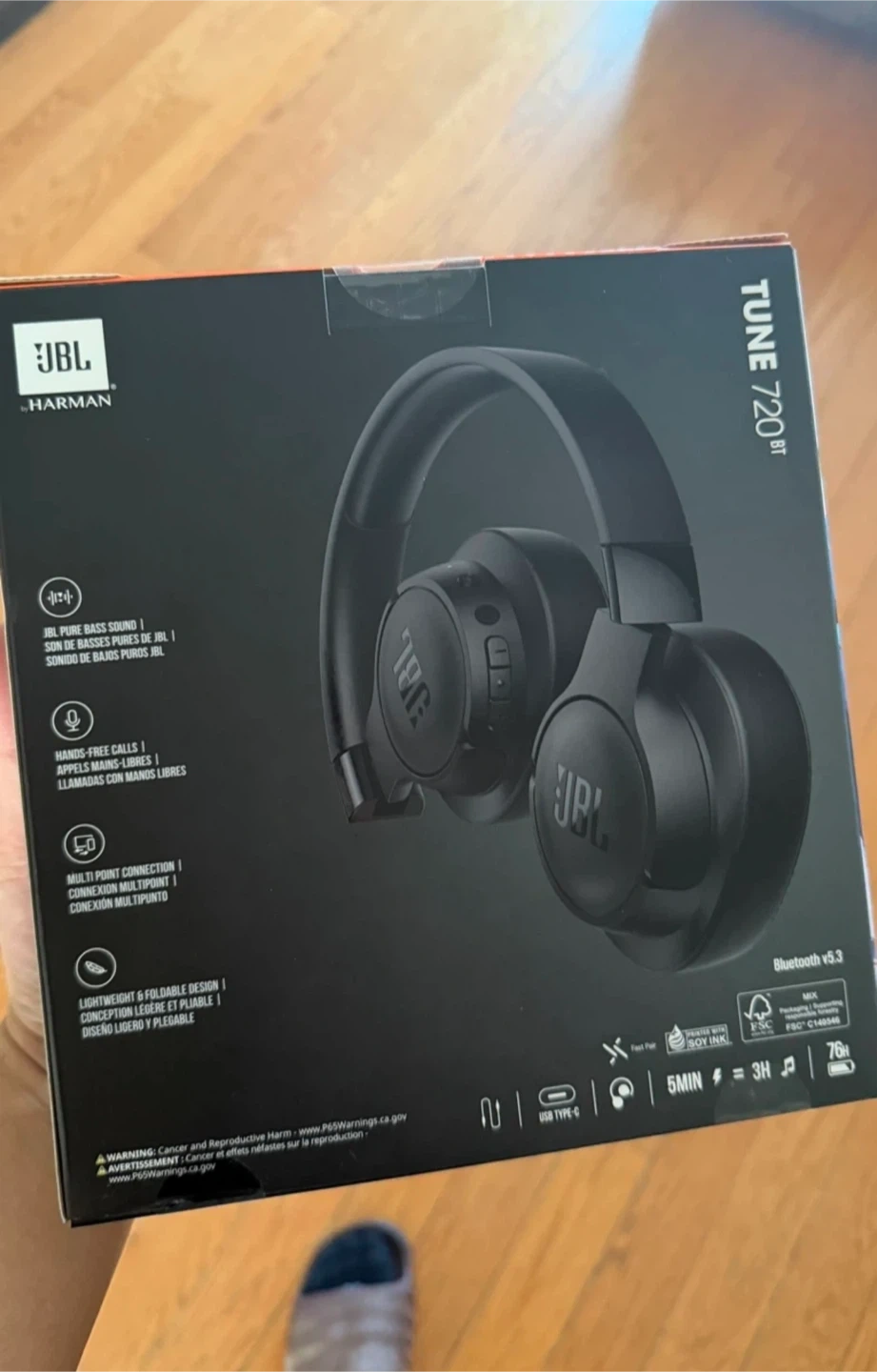 Selling a new pair of JBL Tune 720BT wireless headphones! These headphones are black and come in the original box. They feature pure bass sound and hands-free calls. They also have a lightweight and foldable design, making them easy to carry around. Enjoy up to 76 hours of playtime!