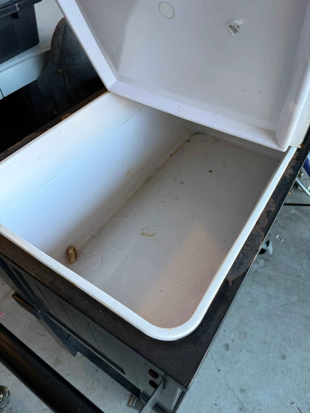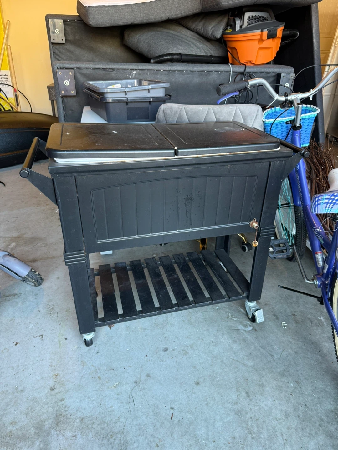 Selling a rolling patio cooler cart in black. It's perfect for outdoor gatherings and keeping your drinks cold. It's in good condition and ready to use!