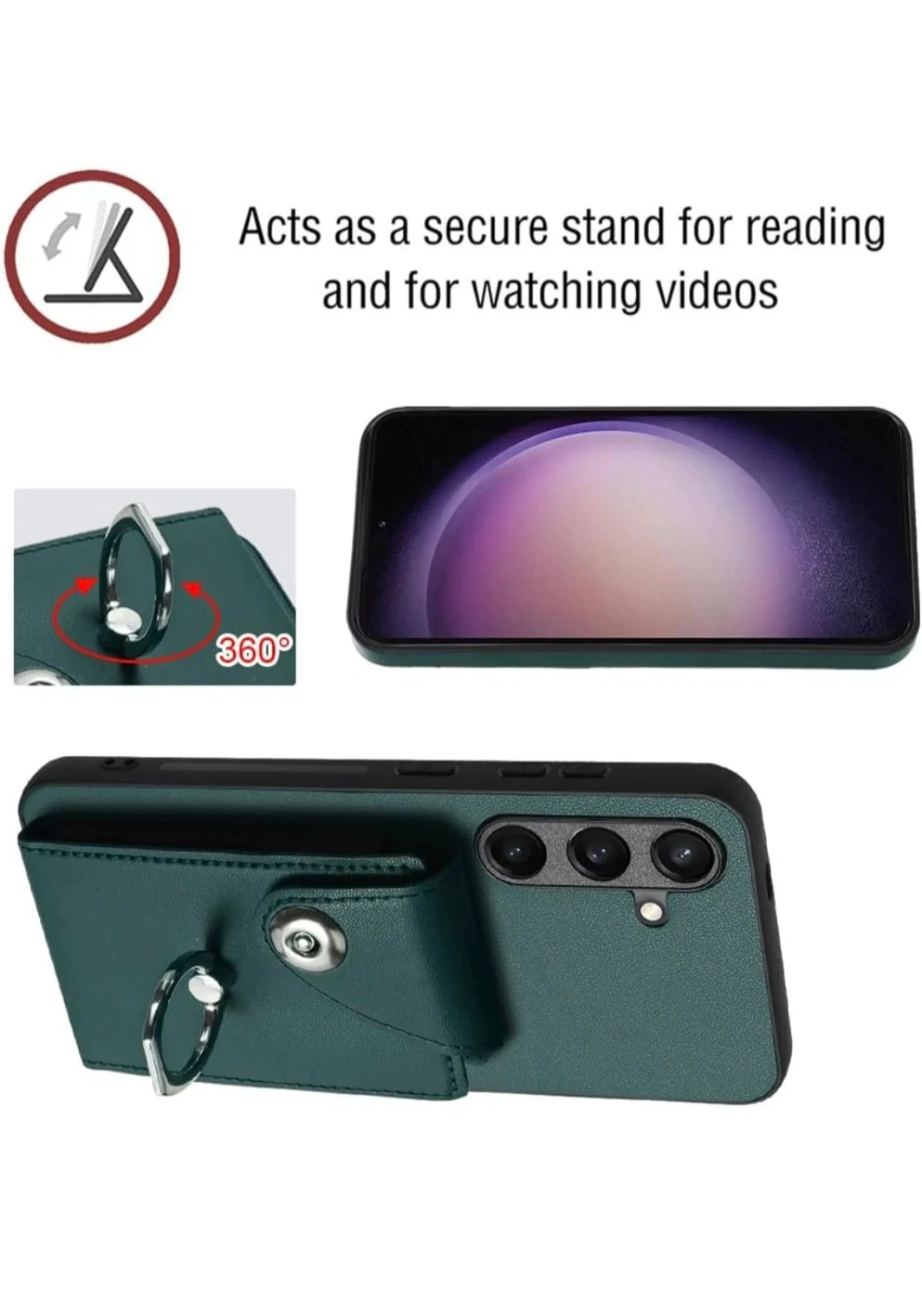 This phone case is designed for Samsung Galaxy s24fe and features a classical wallet design. It also acts as a secure stand for reading and watching videos. The ring stand rotates 360 degrees for easy use