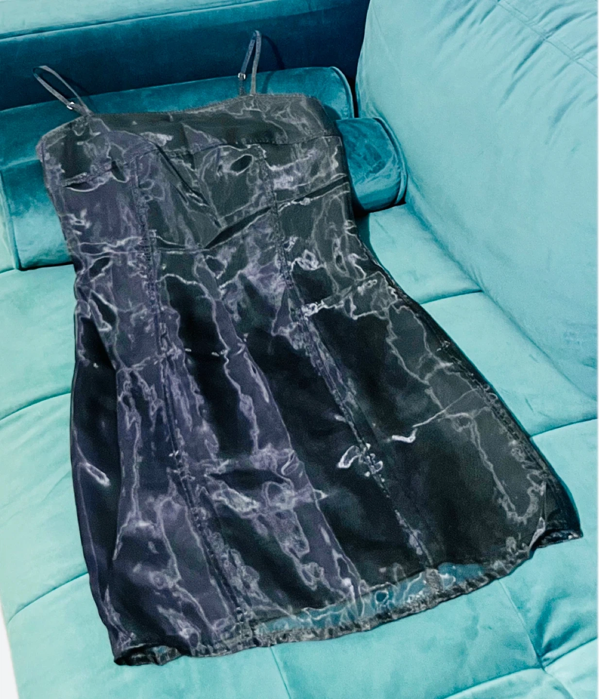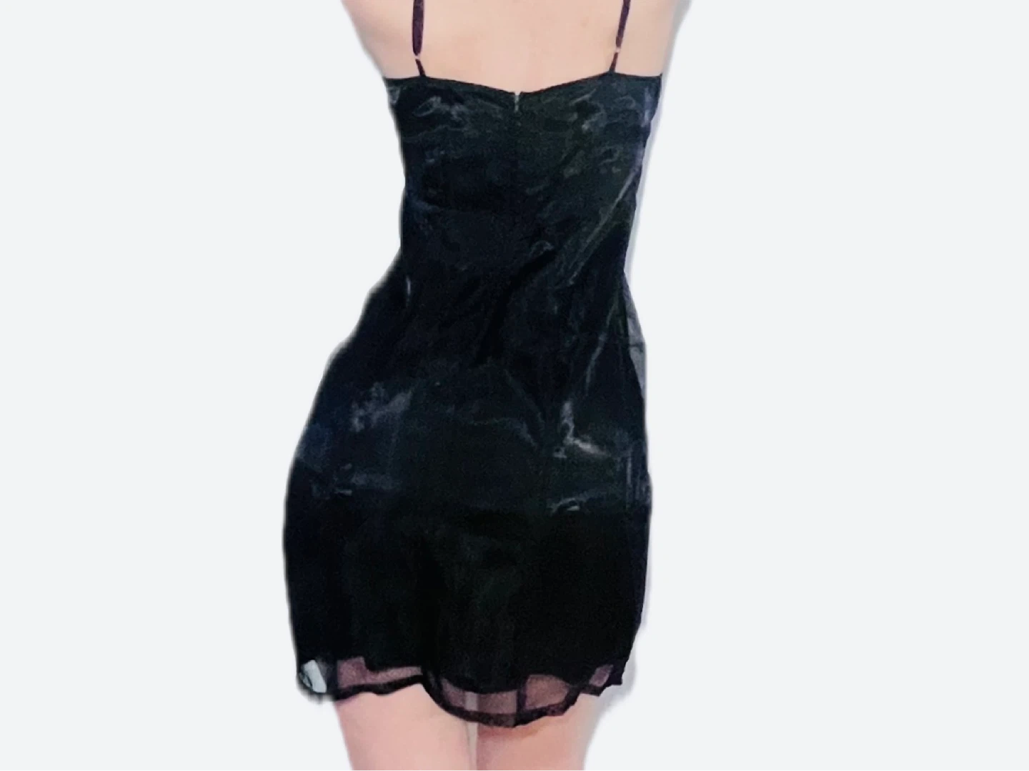 Selling a cute black mini dress. It's in great condition and perfect for a night out or a special occasion. The dress features thin adjustable straps and a flattering silhouette. The top layer is sheer and has an attached slip underneath.