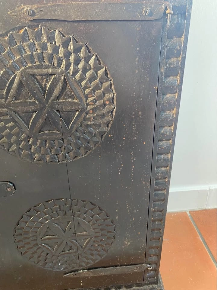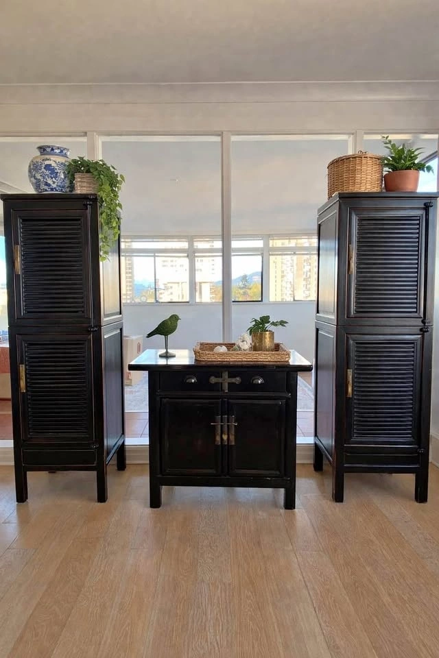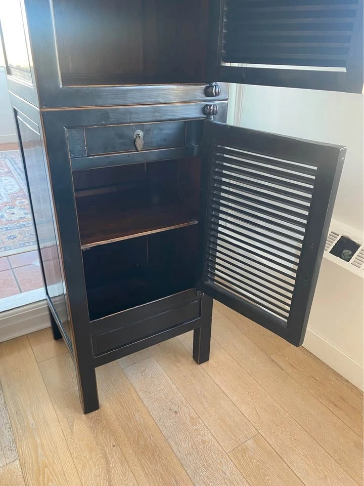 Beautiful, vintage solid wood furniture set from Moe’s Furniture featuring an Asian-inspired / antique black lacquer finish, brass hardware and distinctive hand carved details. Very solid construction and timeless design.