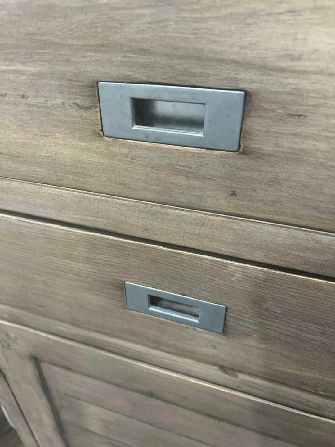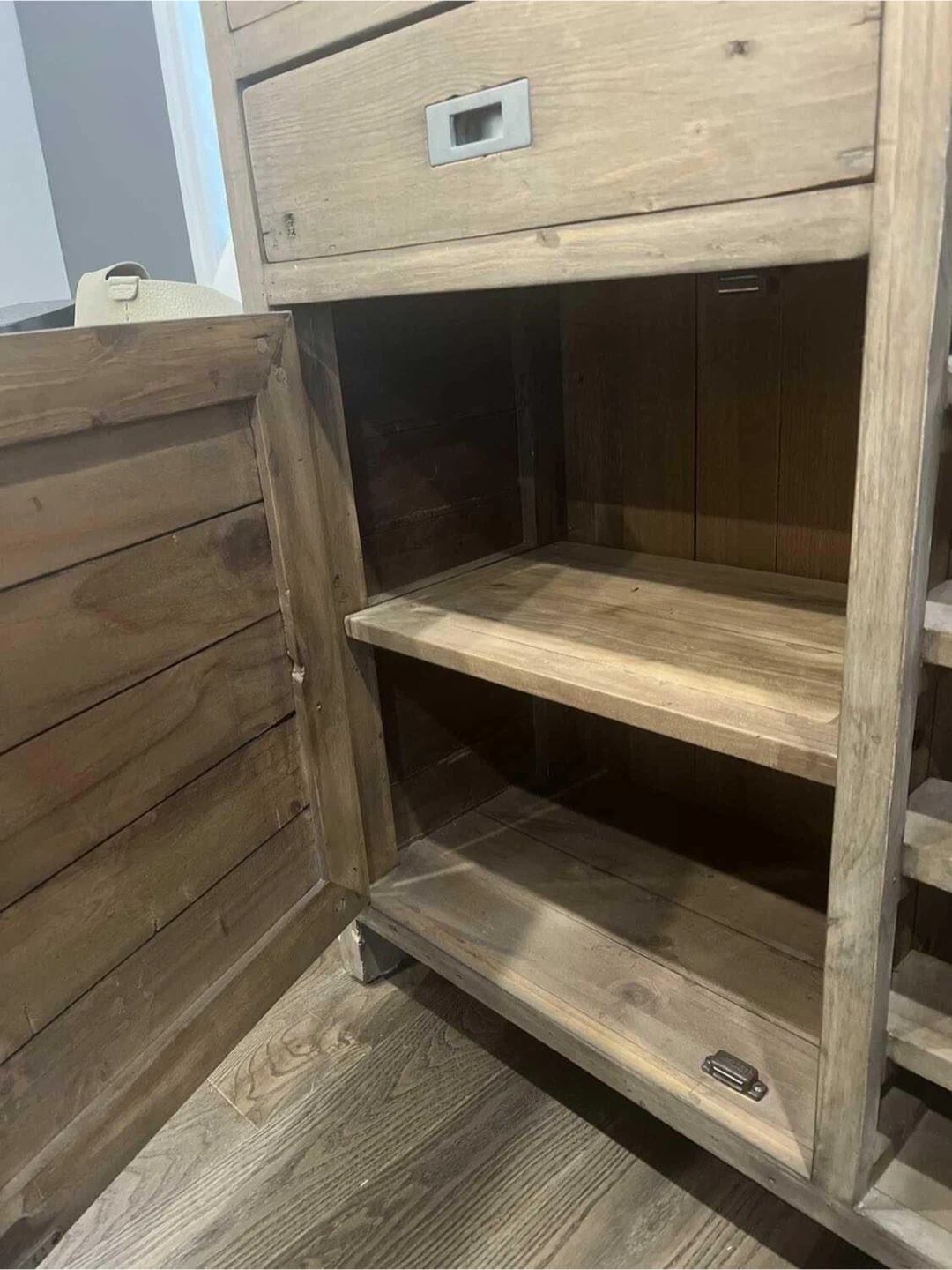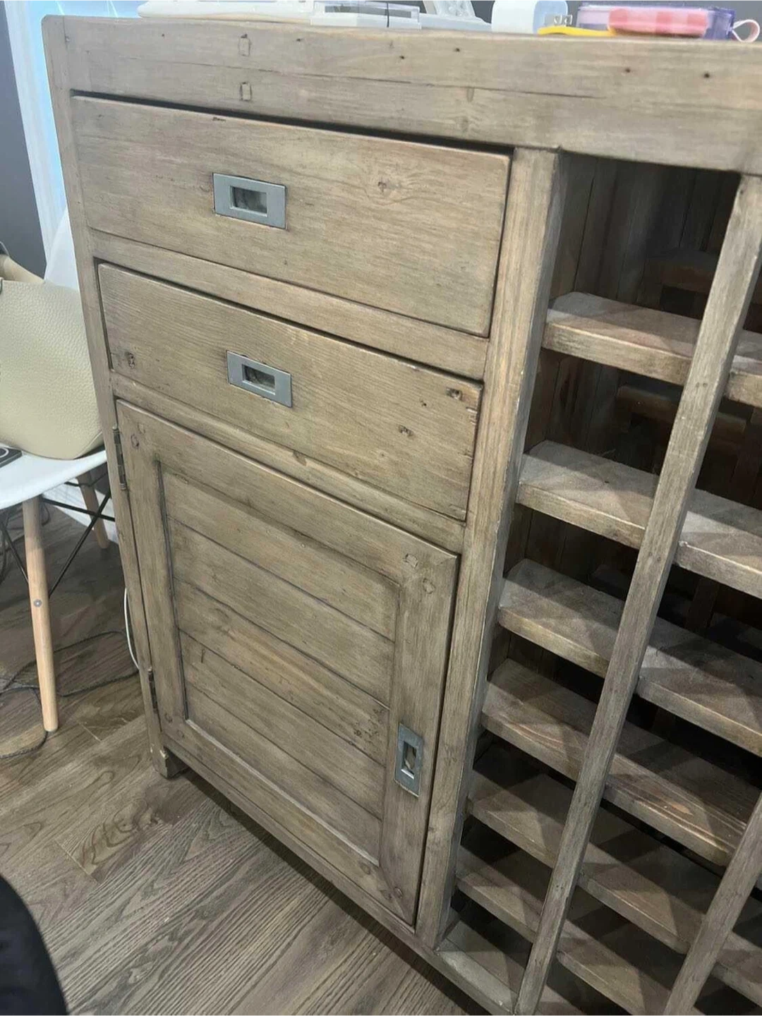 This driftwood wine cabinet holds up to 28 bottles. Lots of storage with 2 drawers and cabinet with a shelf. Excellent condition. Purchased for $700 + hst.