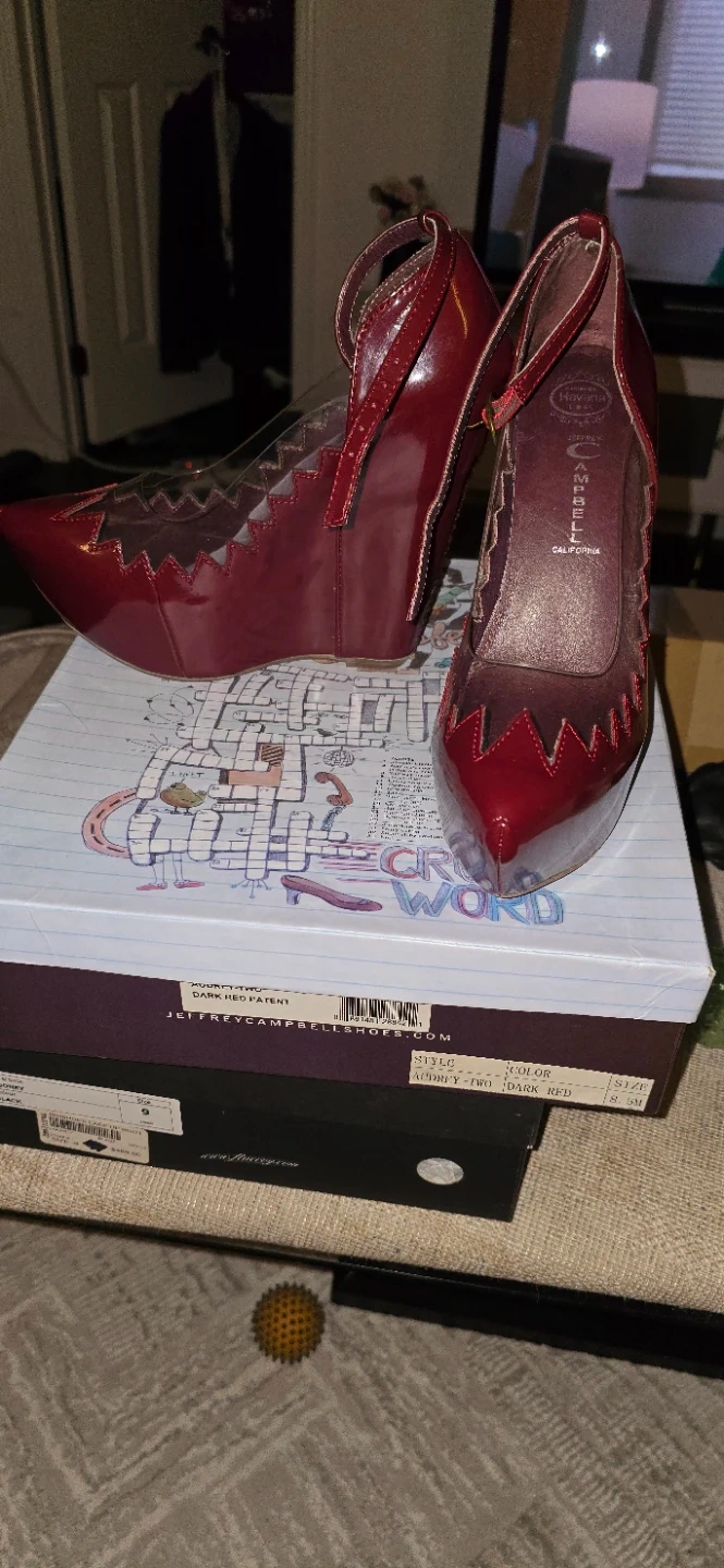 These Jeffrey Campbell Audrey-Two heels are a striking addition to any wardrobe! They come in a dark red patent leather and are a size 8.5. The original box is included! Narrow fit. Worn once. New excellent condition