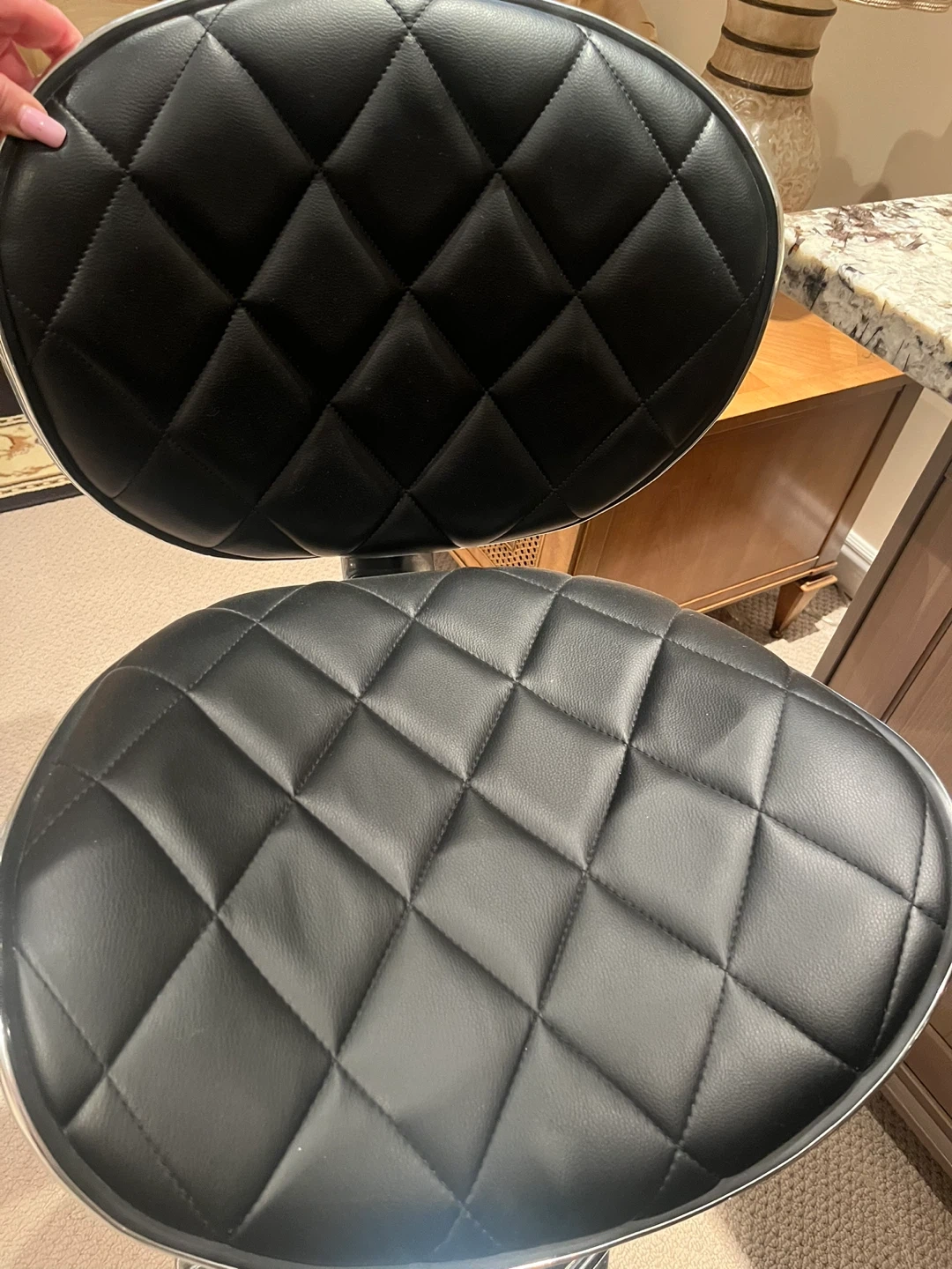 Selling a sleek, black bar stool with an adjustable height feature. It has a quilted pattern on the seat and backrest. The base and stand are chrome. It would be perfect for a kitchen island or bar area!